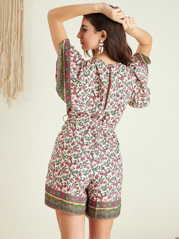 Introducing the Berrylush Pink & Green Floral Printed Playsuit - a quintessential piece for your casual wardrobe. This charming playsuit features a vibrant print of pink and green florals, perfect for breezy days out. The flattering V-neck and flutter short sleeves add a touch of femininity, while the pleated detailing provides a graceful flow. Designed with comfort in mind, it's crafted from soft polyester that stays opaque under all lighting. A flared hemline accentuates the playful silhouette, completed with convenient button closures and an adjustable tie-up waist to ensure a perfect fit every time you wear it!