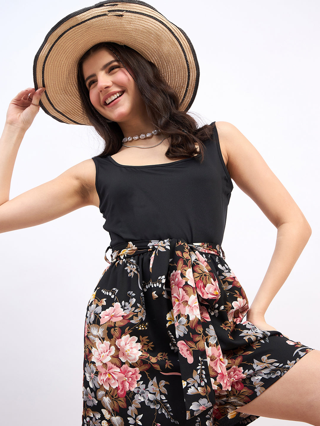 Berrylush Women Black & Pink Floral Printed Square Neck Sleeveless Tie-Up Waist Pleated Mini Jumpsuit