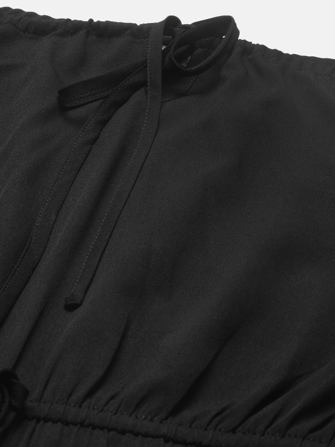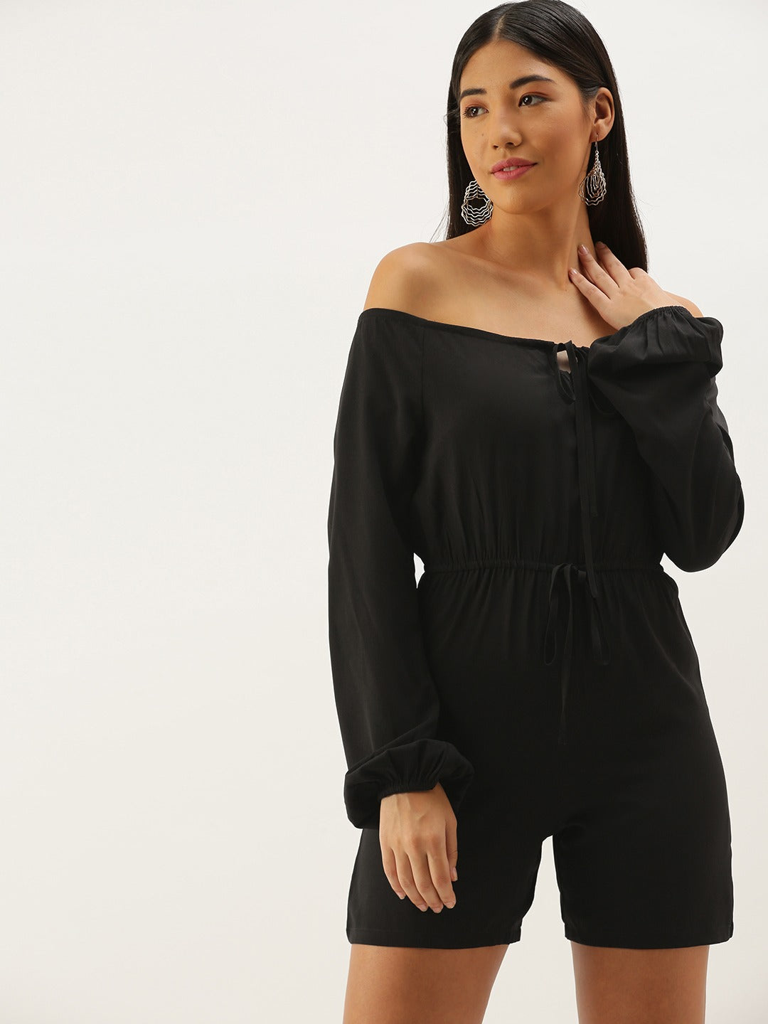 Berrylush Women Solid Black Off-Shoulder Neck Puff Sleeves Tie-Up Front Regular Mini Jumpsuit