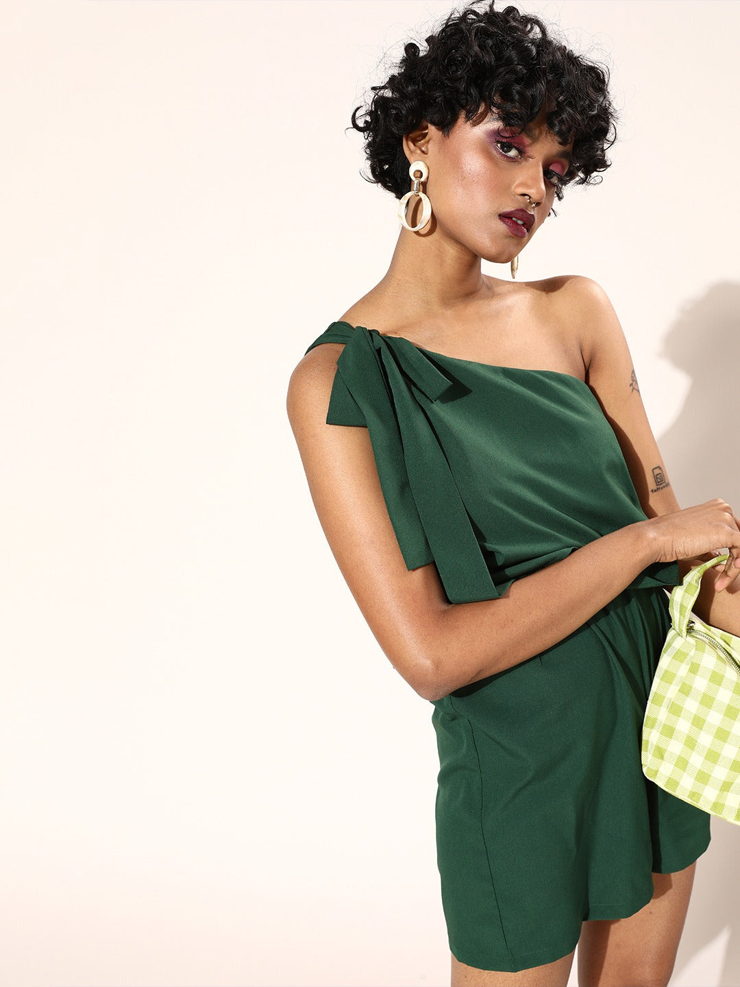 Berrylush Women Solid Green One-Shoulder Neck Tie-Up Strap Two-Piece Romper