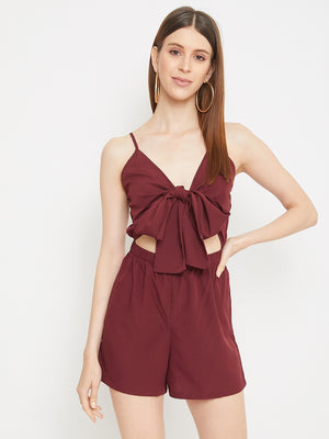 This Playsuit Front Tie-Knot Jumpsuit from Berrylush is perfect for styling and comfort! It is loaded with amazing features like solid maroon color, V-neckline, and sleeveless design to make it gorgeous summer clothing. The polyester fabric offers this jumpsuit enhanced comfort as well as durability for convenient usage and the elastic waistband sits comfortably on your waistline. You will love the combination of front tie-up closure and cutout detailing this clothing has to deliver. Team up this with matching blocked sandals and shiny hoop earrings for a beautiful appearance.