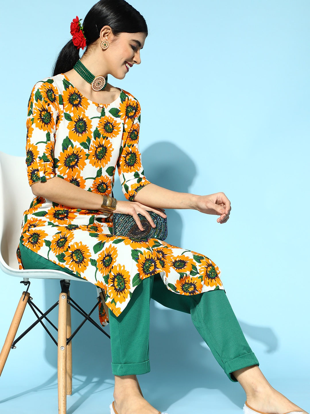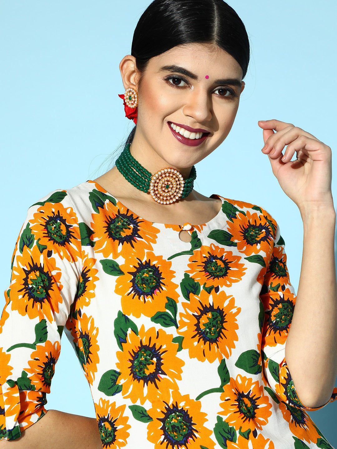 Bestow an enchanting and majestic charm to your traditional capsule by opting for this stunning White & Mustard Yellow Sunflower Printed Keyhole Neck Side-Slited Straight Calf Length Kurta from Berrylush. Spotlighting a keyhole neck design that lends your neckline a fashionable appeal with a breathable structure. Featuring the calf length of this kurta that makes your look appear modest and sophisticated with proper coverage. Flaunting a side-slits design that lends this kurta a practical and fascinating style element with a comfortable experience for your legs. Attend your college fest in a splendid look by teaming up this straight kurta with green solid trousers, matching jewellery, a pair of matching sandals, and a stylish tote bag.