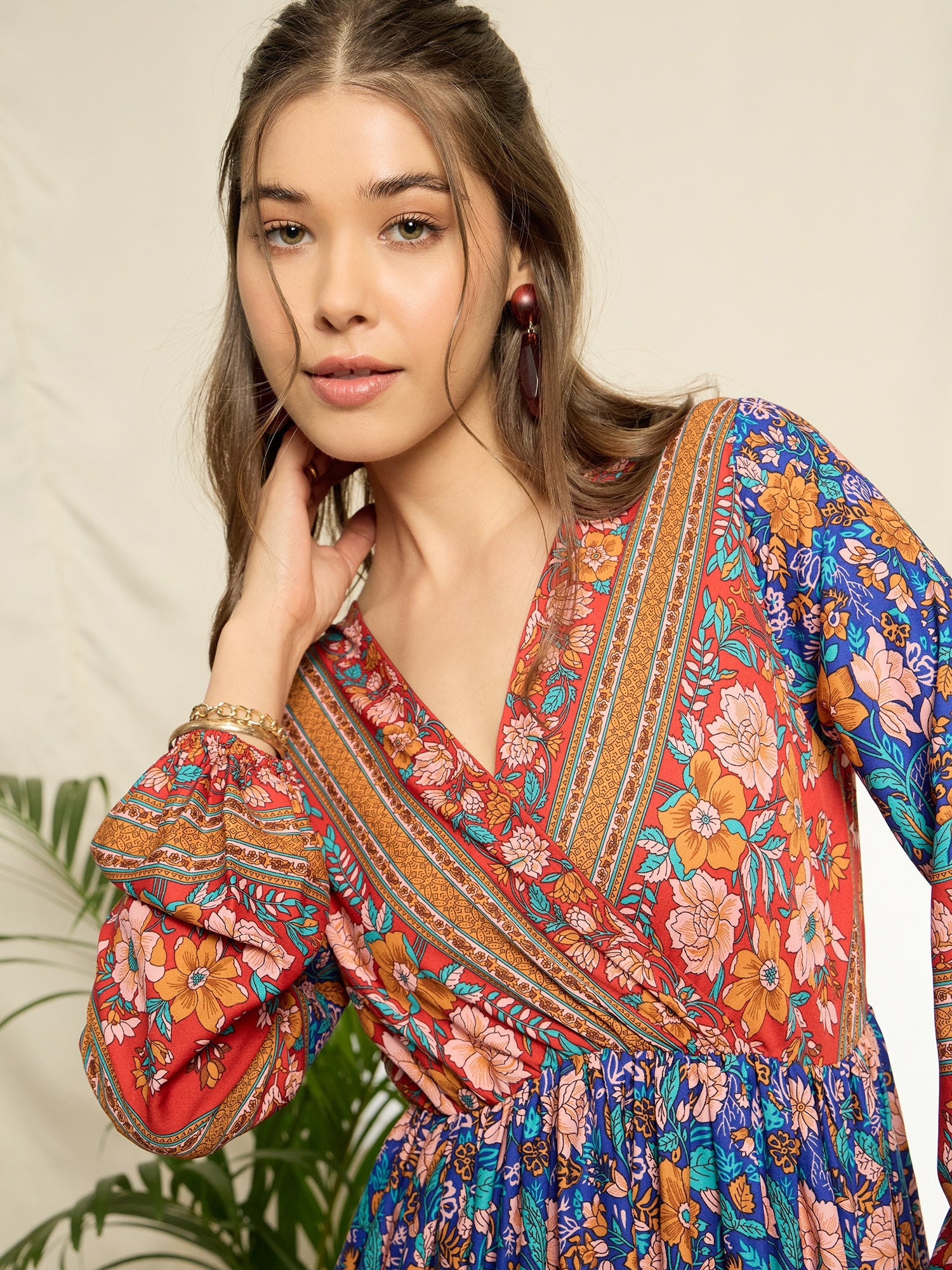 Berrylush Women Blue & Red Floral Printed V-Neck Long Sleeves Wrap Flared A-Line Maxi Kurta