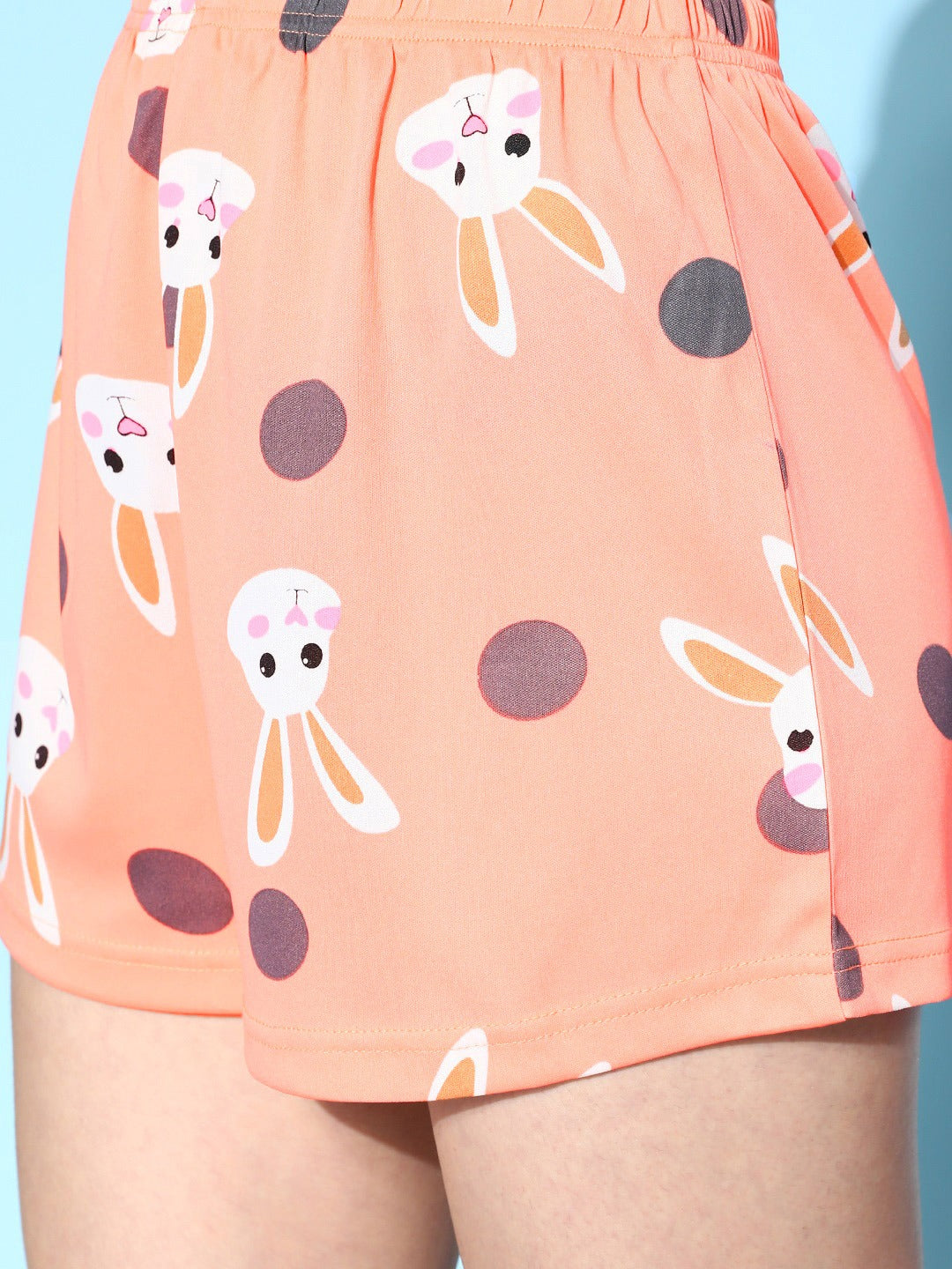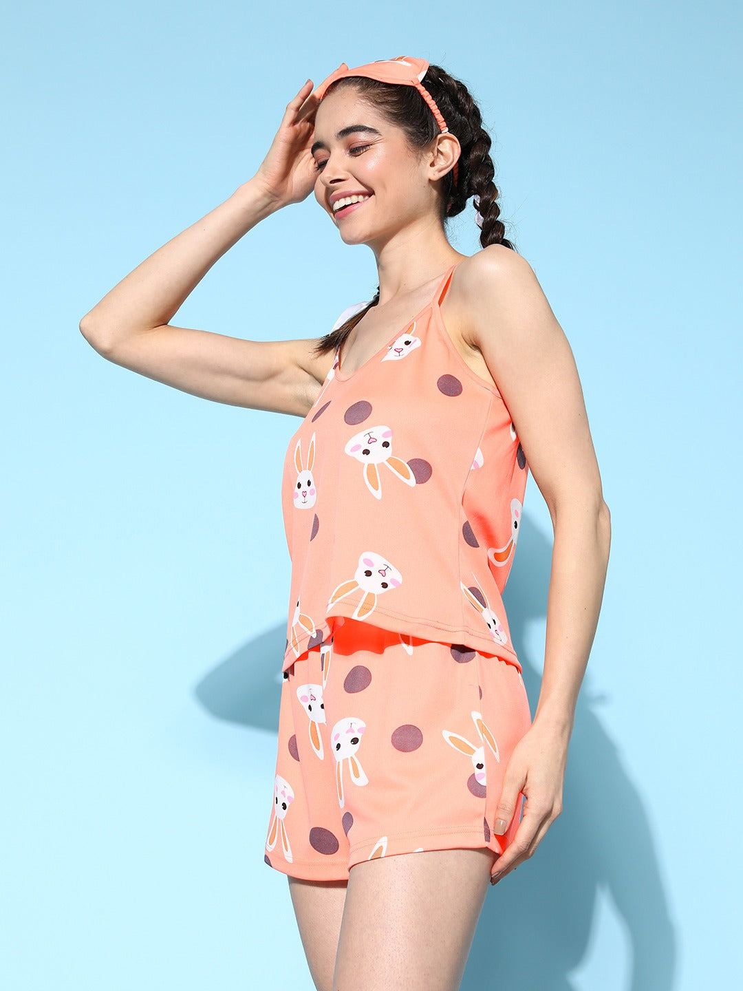 Radiate a cheerful aura with the addition of fun to your evening assortment by selecting this cute Pink and White Cartoon Character Printed Joyful Retreat Night Suit from Berrylush. This night suit is beautifully covered with adorable cartoon character print to give it a dash of playful style with an artistic vibe. Rendered from the finest quality polyester fabric that lends this night soft texture with a total airflow feature to keep your body comfortable and breathable through the night. The sleeveless design offers your arms complete exposure for hassle movements and avoids any kind of interruption. You can wear this night suit with comfy slippers and matching eye masks.