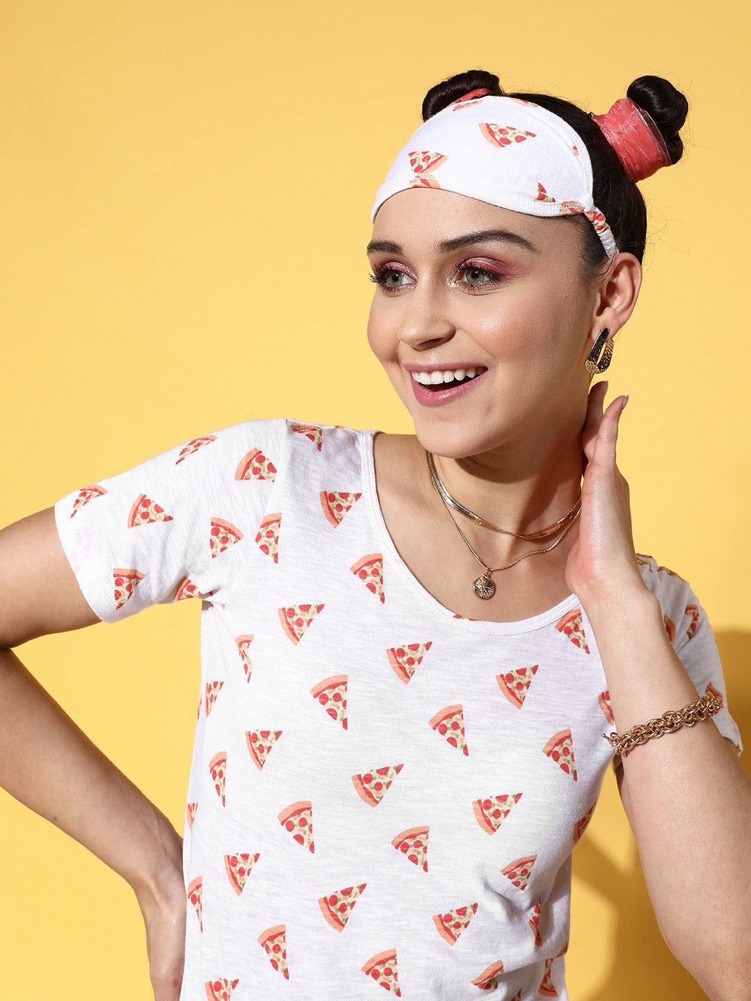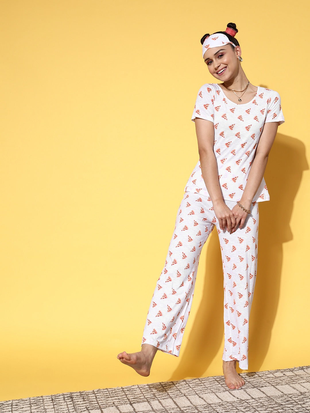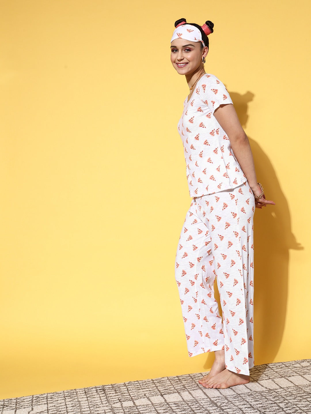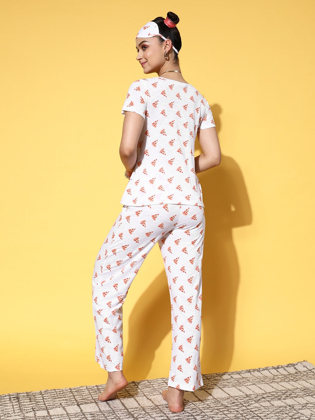 Berrylush Women White Pizza Printed Round Neck Pure Cotton Slip-On Night Suit With Eye Mask