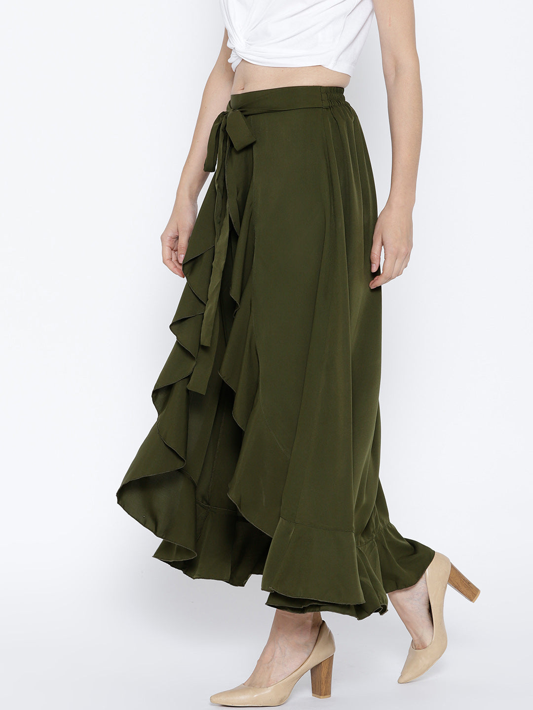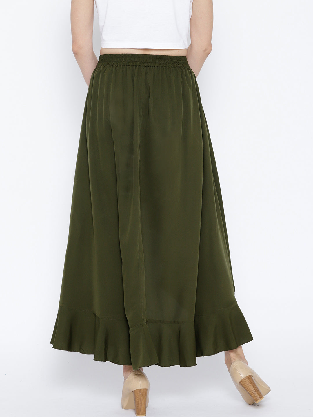 Berrylush Women Solid Olive Green Waist Tie-Up Ruffled Maxi Skirt with Attached Trousers