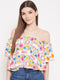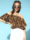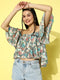 Berrylush Women Green & Brown Floral Printed Off-Shoulder Neck Bell Sleeve Pleated Crop Blouson Top