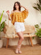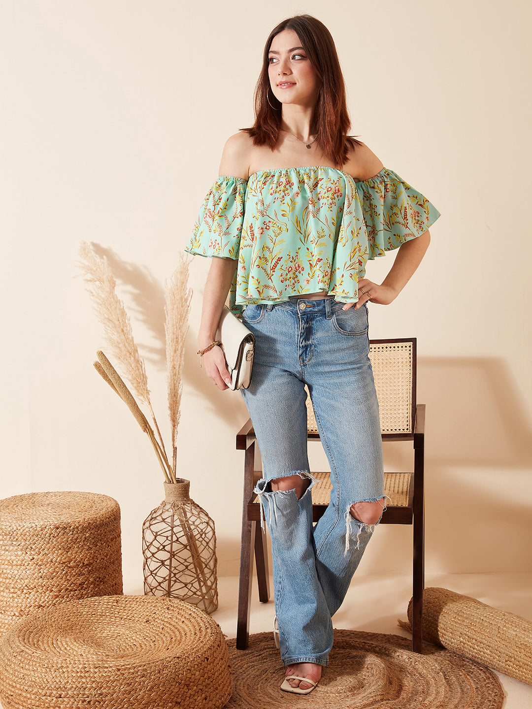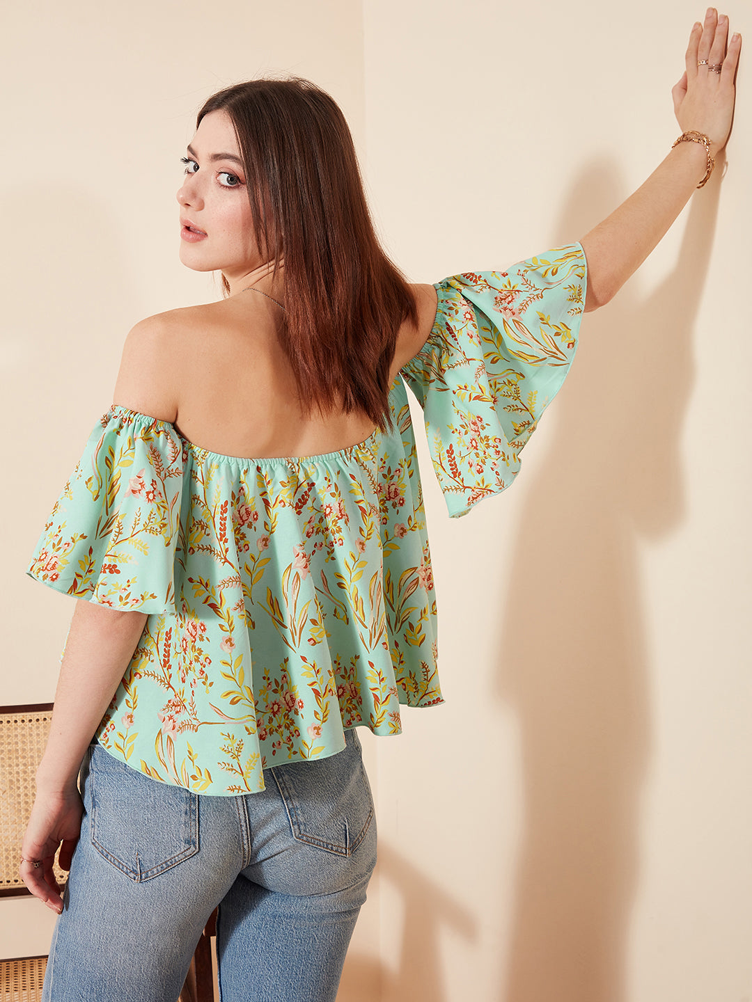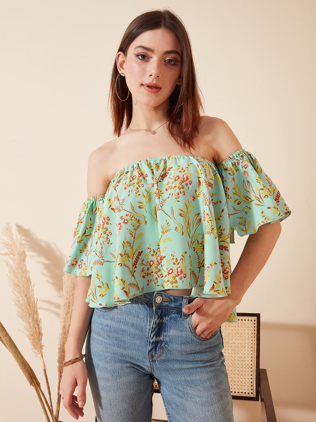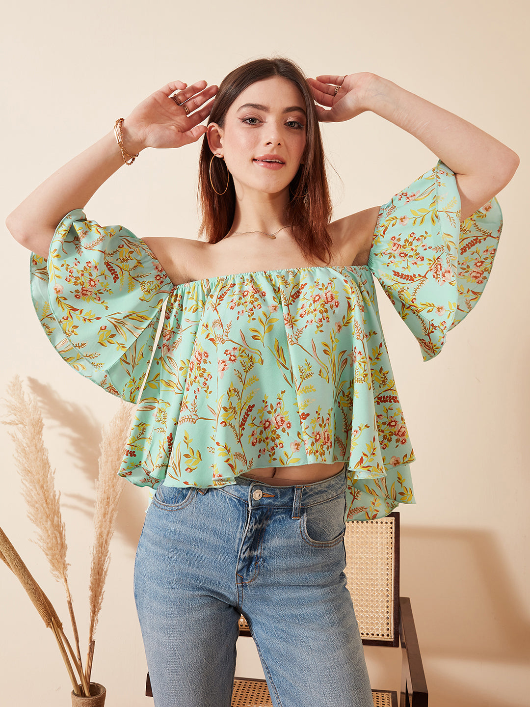 Introducing the enchanting Green & Brown Floral Printed Off-Shoulder Neck Bell Sleeve Pleated Crop Blouson Top from Berrylush. Crafted with exquisite attention to detail, this top is a masterpiece of smart casual wear. The luxurious polyester fabric weaves comfort and style into every thread, while its off-shoulder neckline adds a touch of allure. Short bell sleeves flutter with grace, and the pleated surface styling brings texture to its crop blouson silhouette. Emblazoned with vibrant green and brown florals, it's opaque yet daringly feminine—a perfect blend for those who love to make a statement in their day-to-day ensemble.