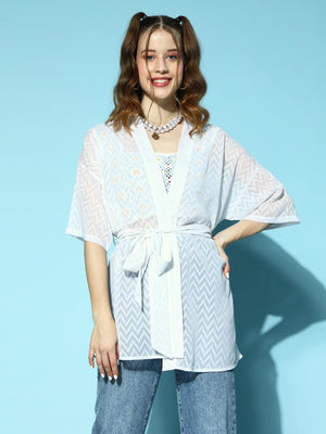 Berrylush Women White Self-Design Pattern Open Front Waist Tie-Up Georgette Regular Shrug