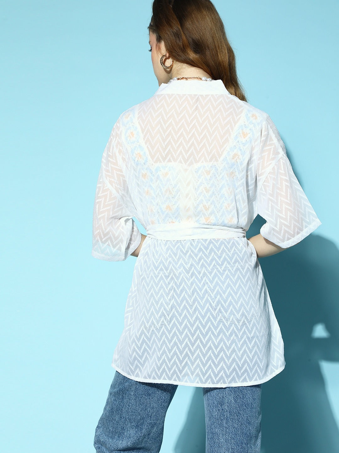 Revamp your capsule closet with the chic and coolest style that are ruling the latest trend just like this beautiful White Self-Design Pattern Open Front Waist Tie-Up Georgette Regular Shrug from Berrylush. Made to give a graceful definition and flattering appeal to your curves as this shrug is designed with a regular fit. Featuring regular length which enables this shrug that provides convenient coverage to your upper body with an urban appeal. Also, the cinematic amalgam of white shade with chevron print lends this shrug a captivating design with charismatic charm. Layer up this chevron-printed shrug with a tube top, high-waist denim jeans, a pair of white sneakers, and a black waist bag to get a relaxing yet stylish look.