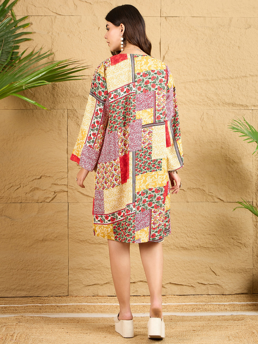 Berrylush Women Red & Yellow Floral Printed V-Neck Open-Front Straight Hem Longline Shrug