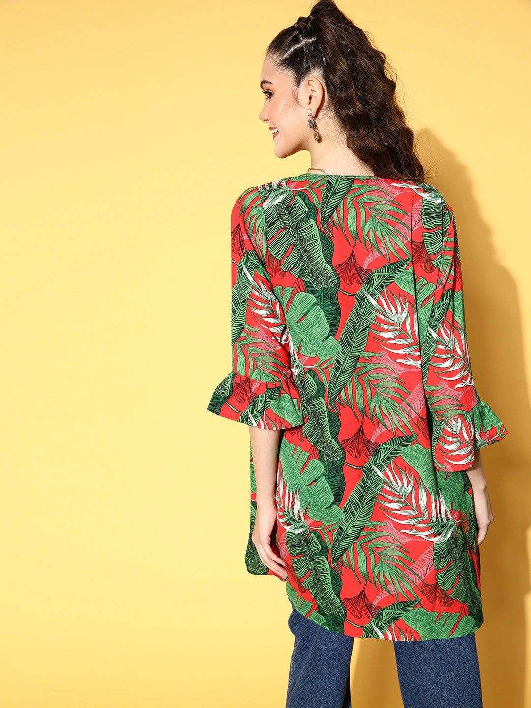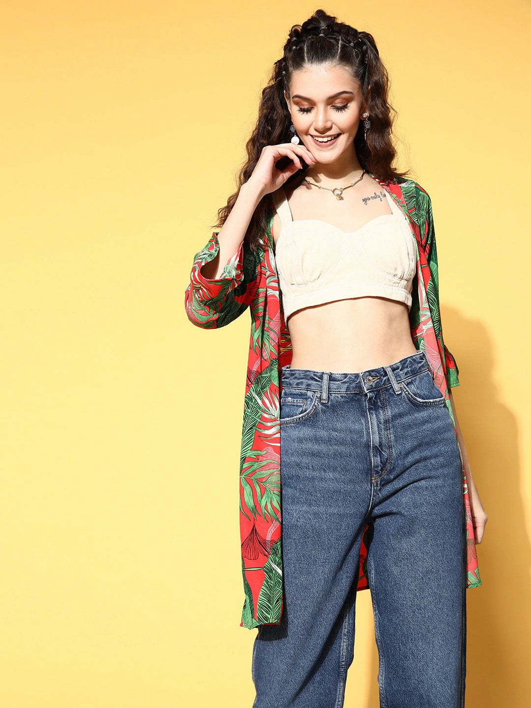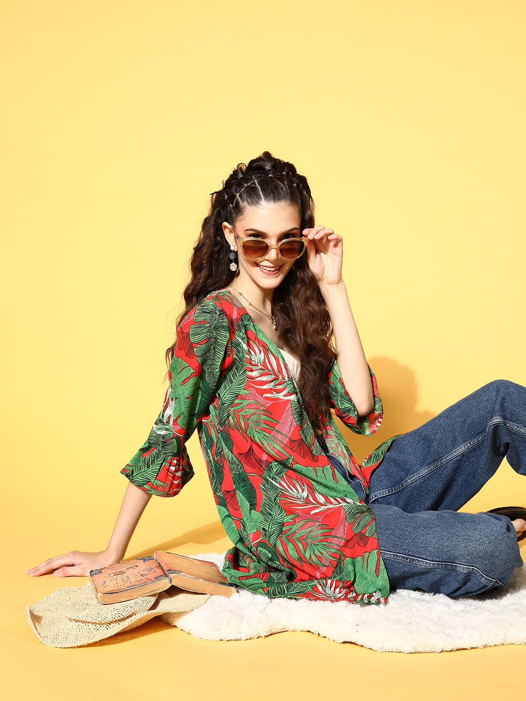 Indulge contemporary and cool charm in your outdoor wear with this dazzling Deep Red & Green Floral Printed Open Front Straight Hem Shrug designed by Berrylush. Rendered from high-quality polyester fabric to make this shrug wrinkle-resistant and to offer limitless comfort. Fashioned with three-quarter bell sleeves that lend your arms an attractive coverage. Comes with open front styling that gives a fascinating exposure to your beautiful neckline and waistline area. Mix and match this chic vacay attire with floral print shorts, a classy crop top, a pair of pump heels, fun hoop earrings, and a stylish handbag for creating a fashion-forward look.