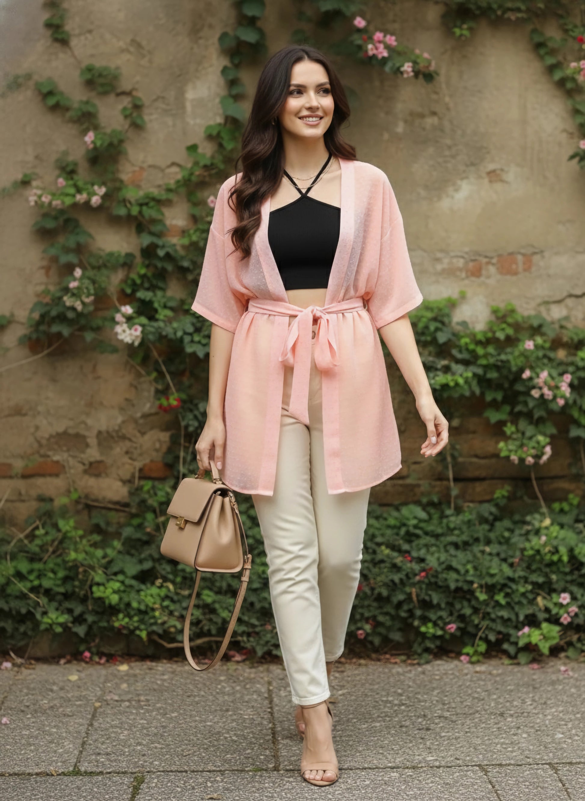 Berrylush Women Pink Self-Design Pattern Open Front Waist Tie-Up Georgette Regular Shrug
