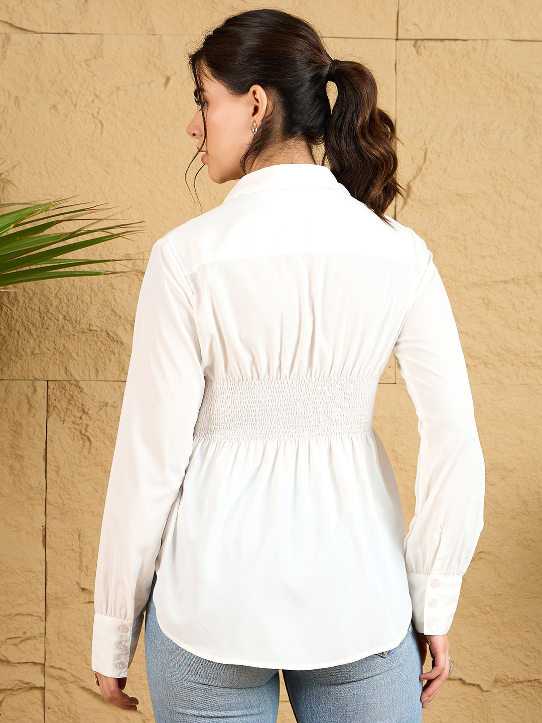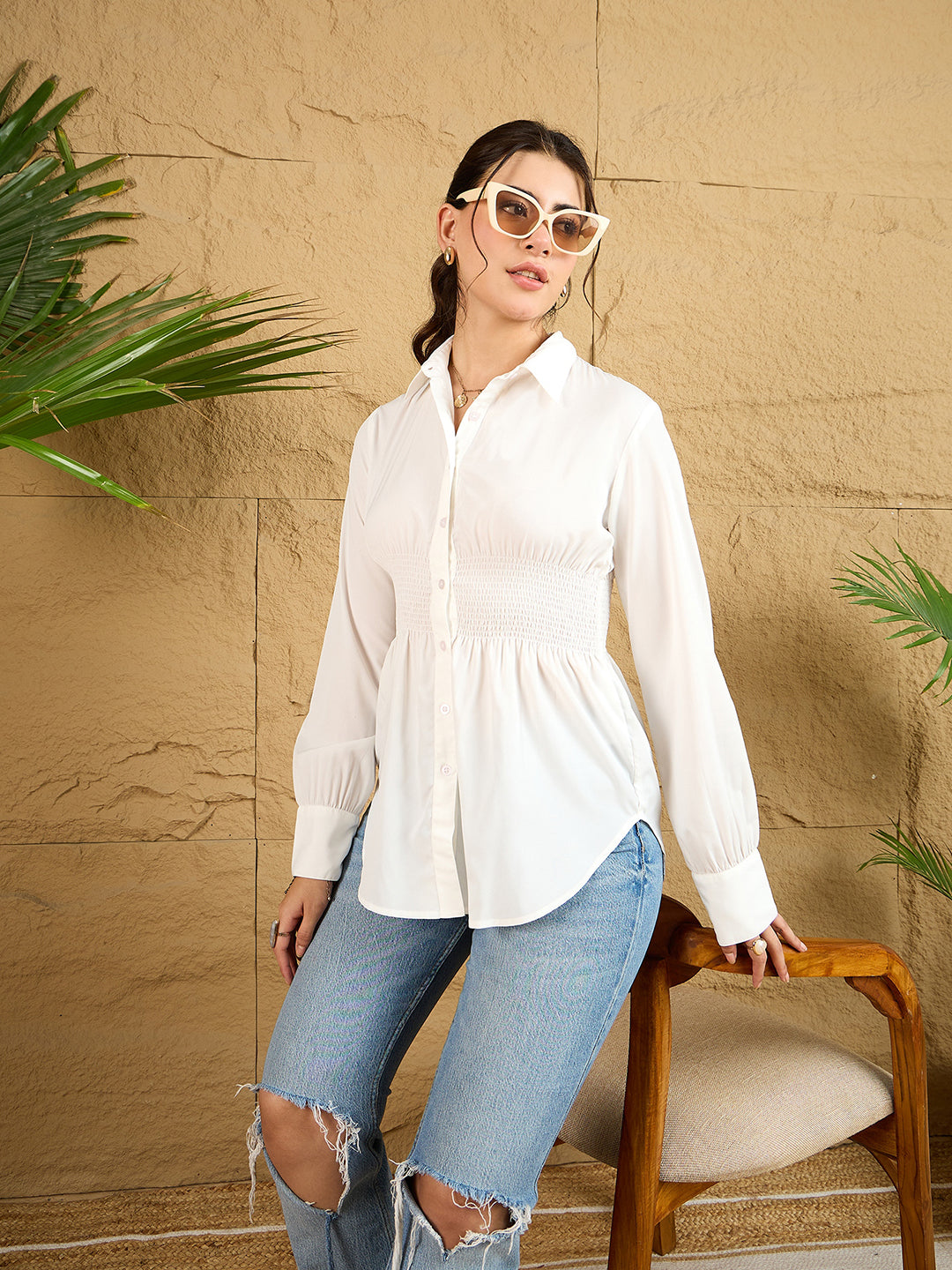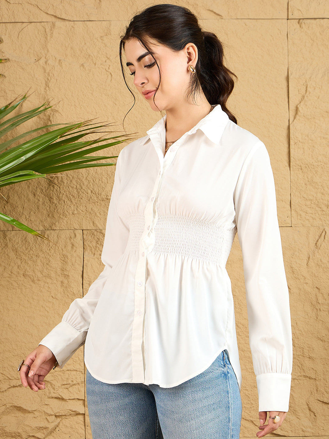 Elevate your casual wardrobe with Berrylush's sophisticated white shirt. This versatile piece features a refined spread collar and delicate gathering details that add feminine flair to the classic silhouette. The opaque polyester fabric ensures comfort while maintaining a polished look throughout the day. Thoughtfully designed with a curved hemline and traditional button closure, this woven shirt offers both style and functionality. The long sleeves provide perfect coverage, while the regular fit flatters various body types. Whether paired with jeans for a coffee date or styled with trousers for a business casual look, this timeless shirt effortlessly transitions from day to night.
