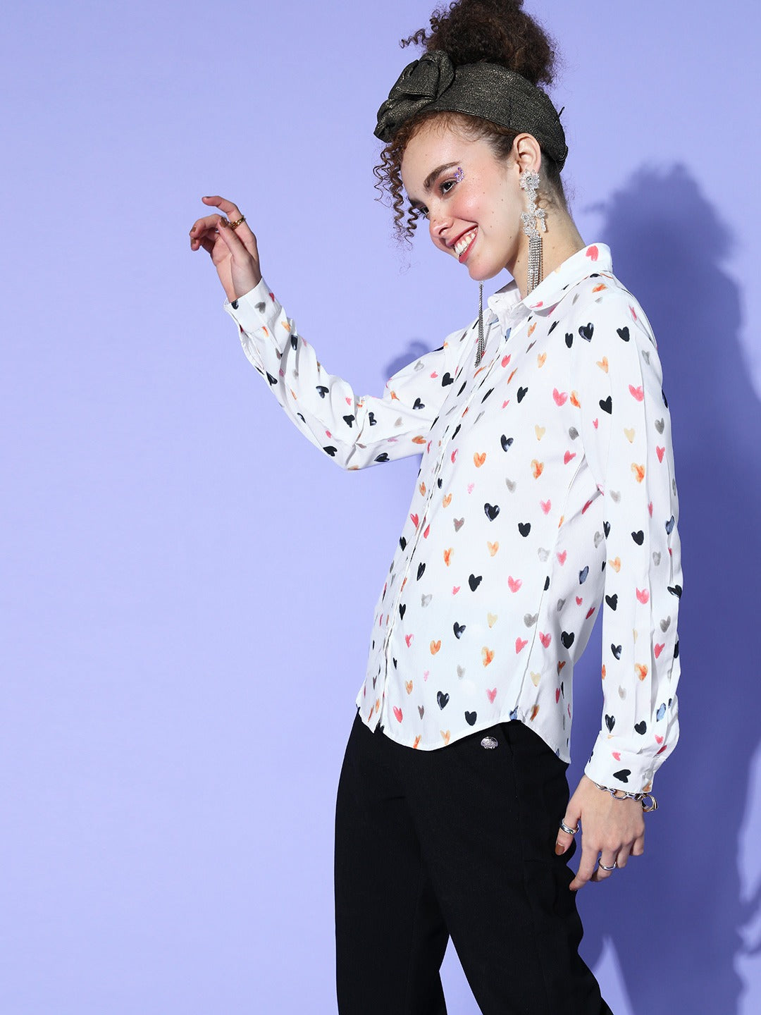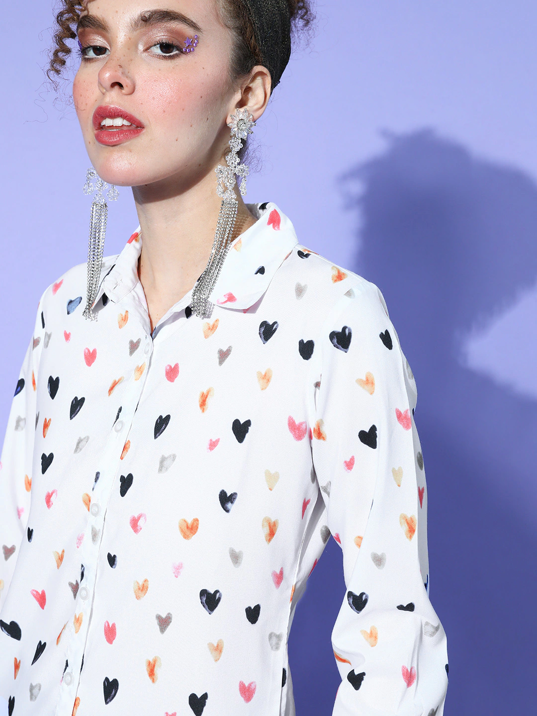 Berrylush Women White Heart Printed Spread Collar Neck Front Button Curved Hem Regular Shirt
