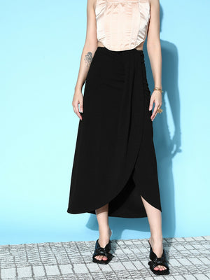 Berrylush Women Solid Black High-Rise Waist Asymmetrical Hem Pleated Maxi Skirt