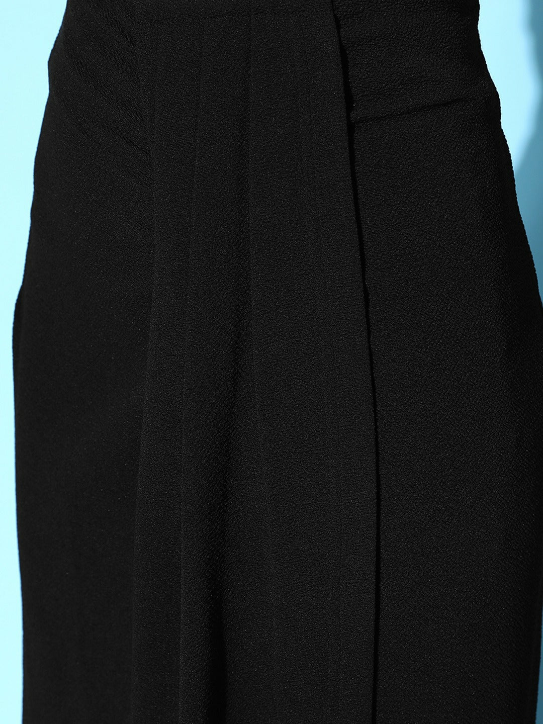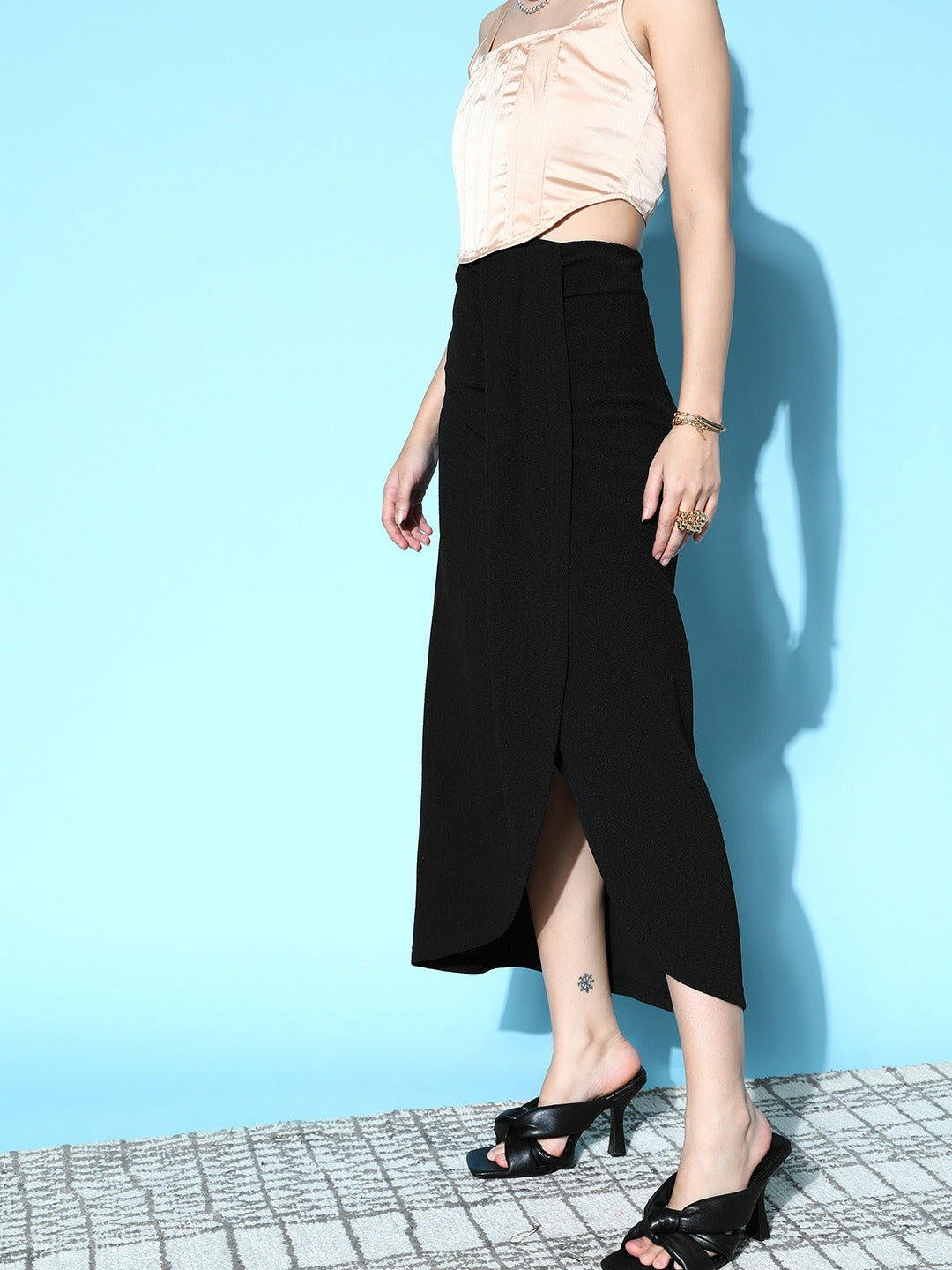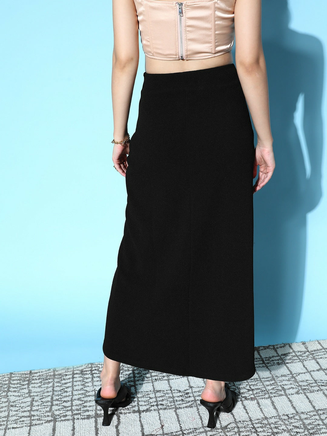 Walk out of your home with the aim to steal the limelight with your unique fashion sense by investing in this captivating Solid Black High Waist Draped Maxi Skirt from Berrylush. Styled with pleated surface styling that adjoins small pleats and flair to this skirt to enhance the overall volume of this skirt. Presenting slip-on closure that supports an easy-to-wear style without consuming much time along with a sleek sheen to this skirt. Comes with knitted detailing that enhances the durability and structural integrity of this skirt to withstand easy wear and tear issues. Complete your party looks beautifully by teaming this maxi skirt with a crop top, black block heels, pearl stud earrings, and a chic side bag.