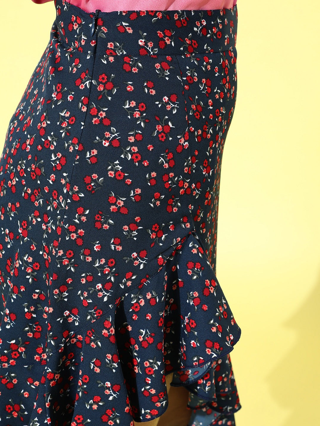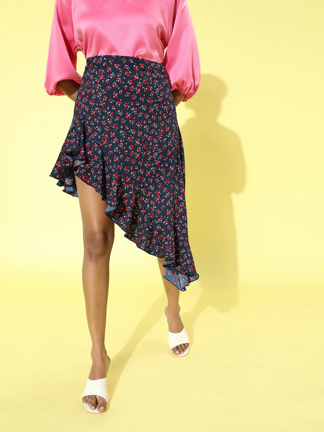Berrylush Women Navy Blue Floral Asymmetric Hem Ruffled Mini Skirt
