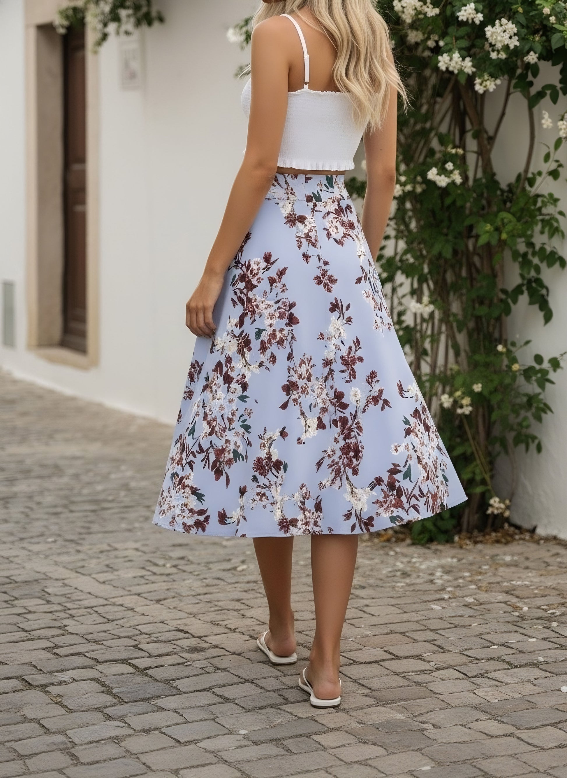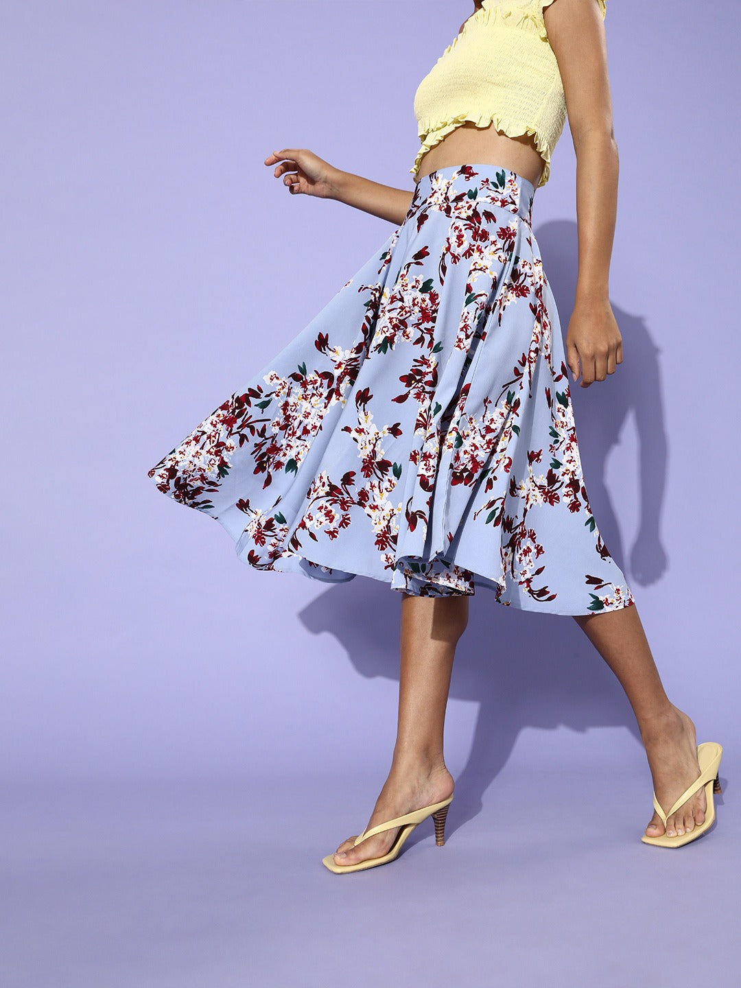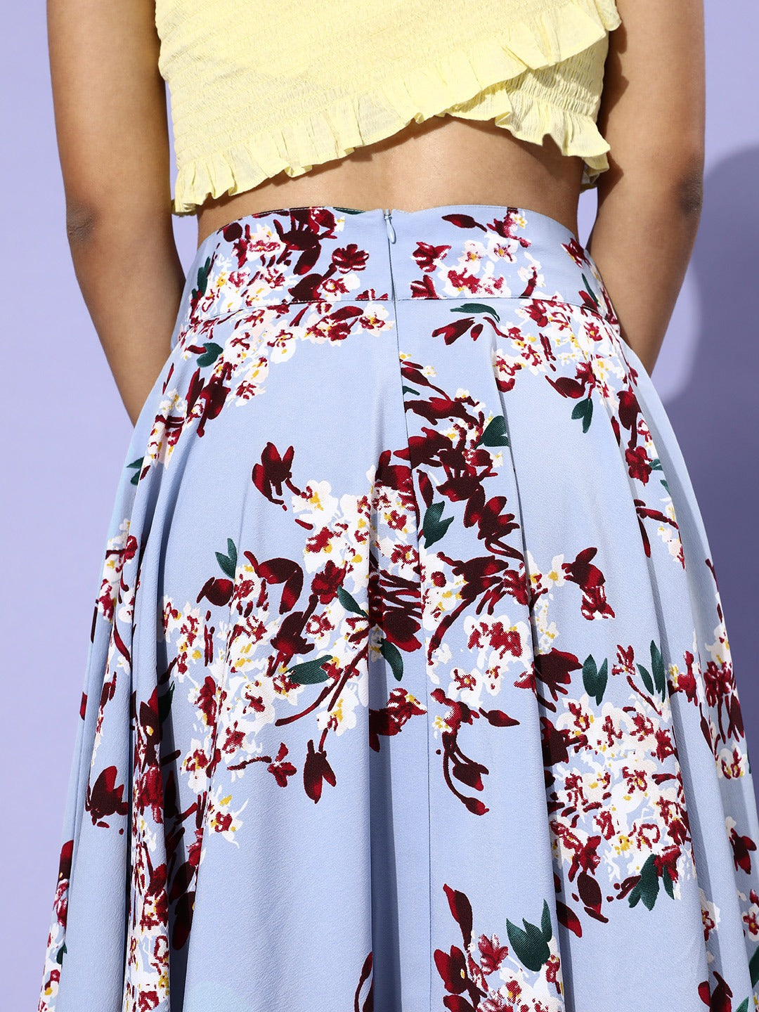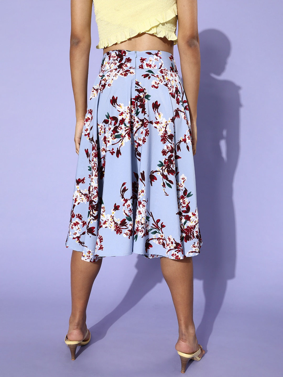Invite the fresh aura within your casual style by wearing this Blue & Red Floral Printed Flared A-line Midi Skirt from Berrylush. Get the actual essence of the springtime by wearing this fascinating floral printed midi skirt for your evening casual style. Get the teenage charm on your legs with the pleated flares. Bring a soothing and relaxing sensation within your way of styling by wearing this casual outfit. Get the unmatched support with the back concealed zip closure that stays hidden but gives you the best support. Match this soothing casual bottom wear with a crop top and heeled stilettos. Bring a mesmerizing aura to your casual look with this floral midi skirt from Berrylush.