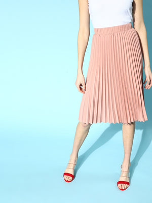 Berrylush Women Solid Pink Accordion Pleated Slip-On Waist Crepe Flared A-Line Midi Skirt