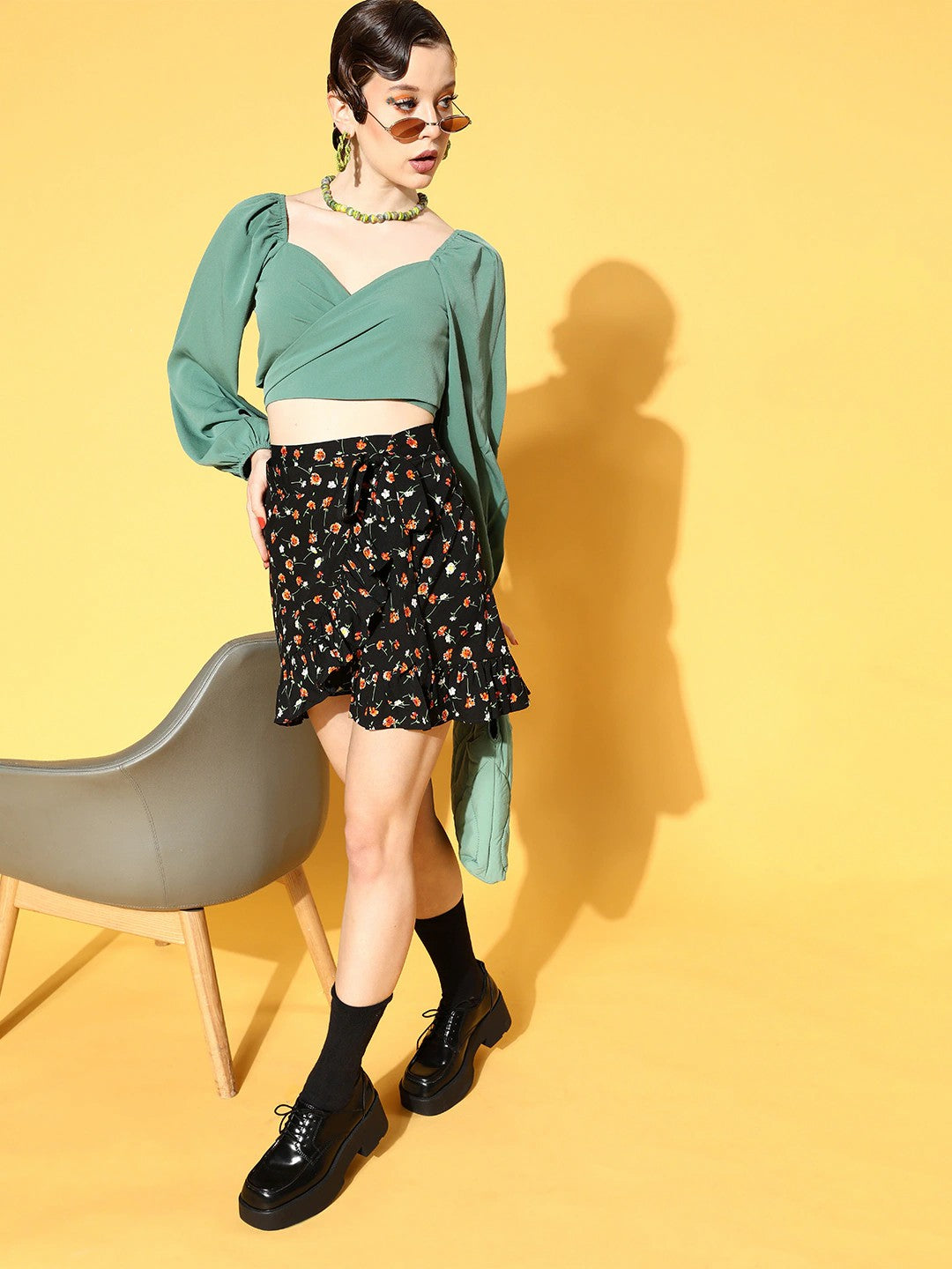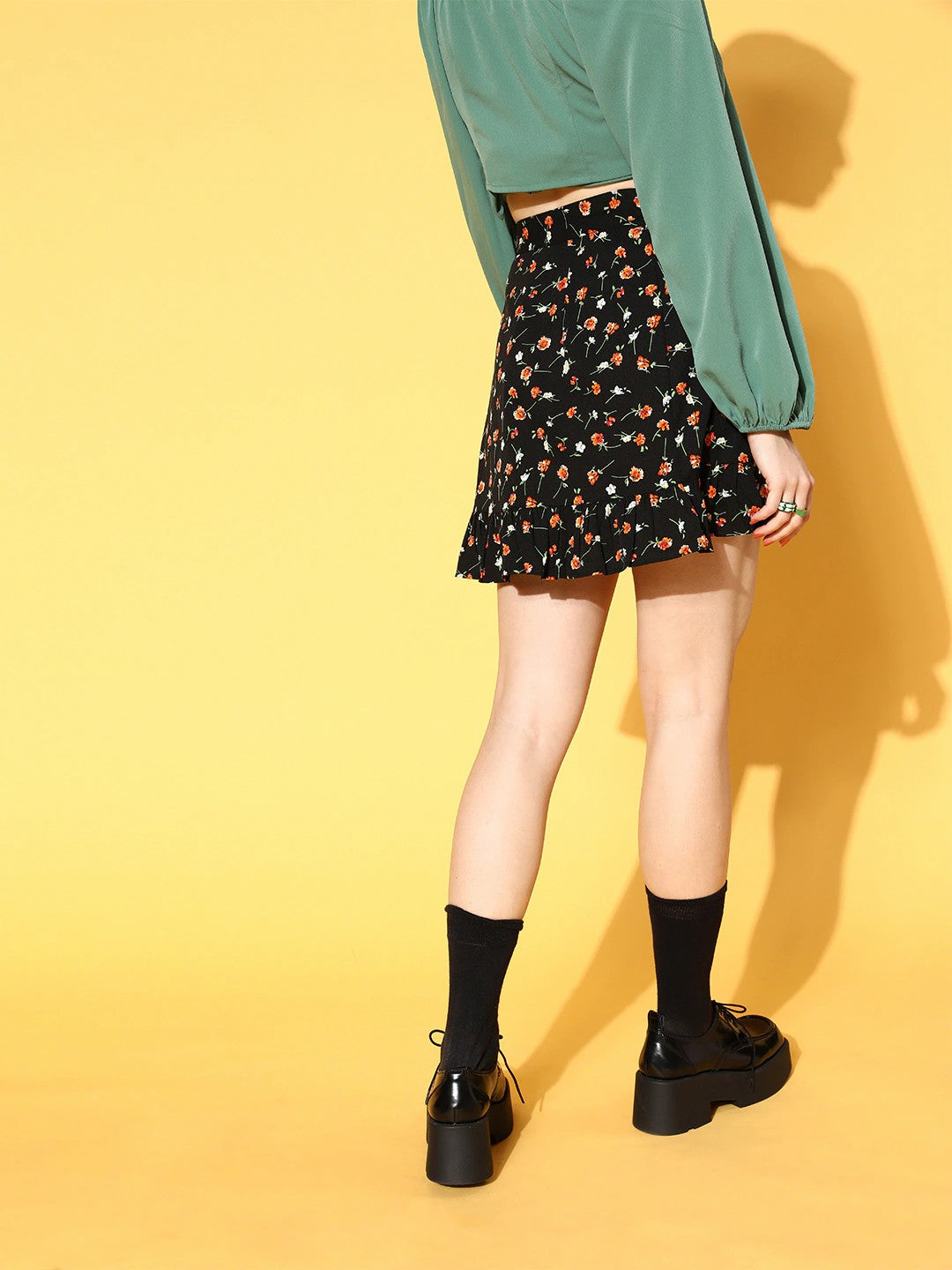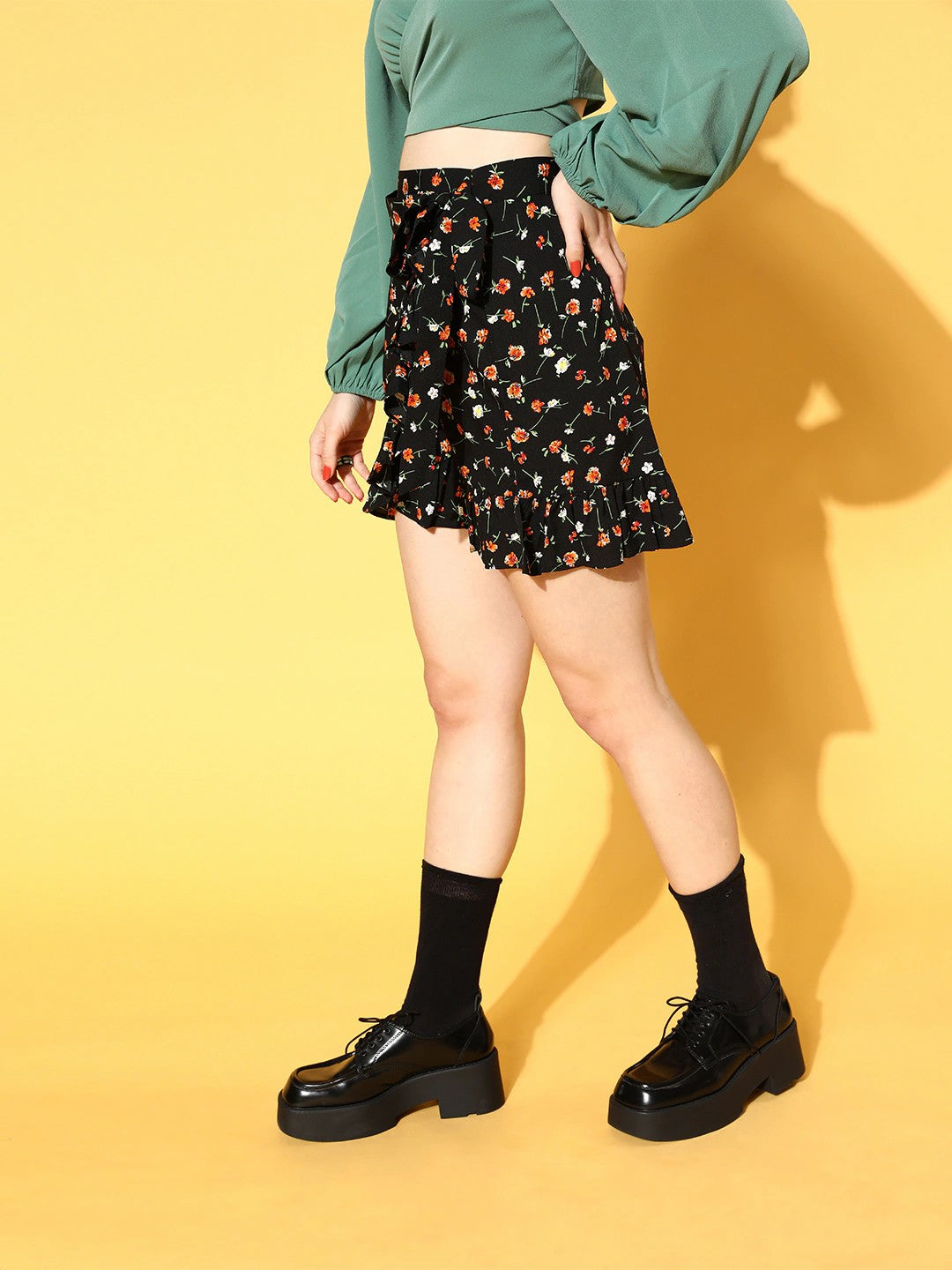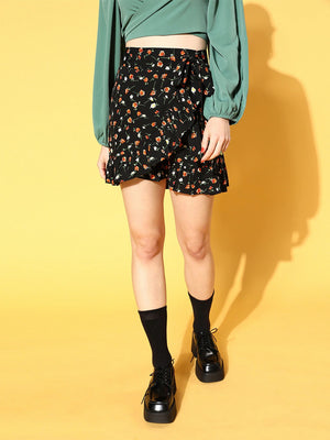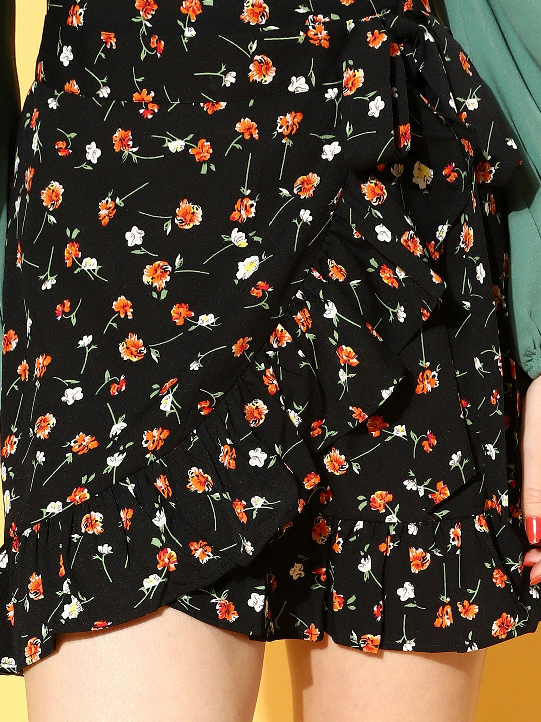 Berrylush Women Black & Orange Floral Printed Waist Tie-Up Ruffled Wrap Mini Skirt