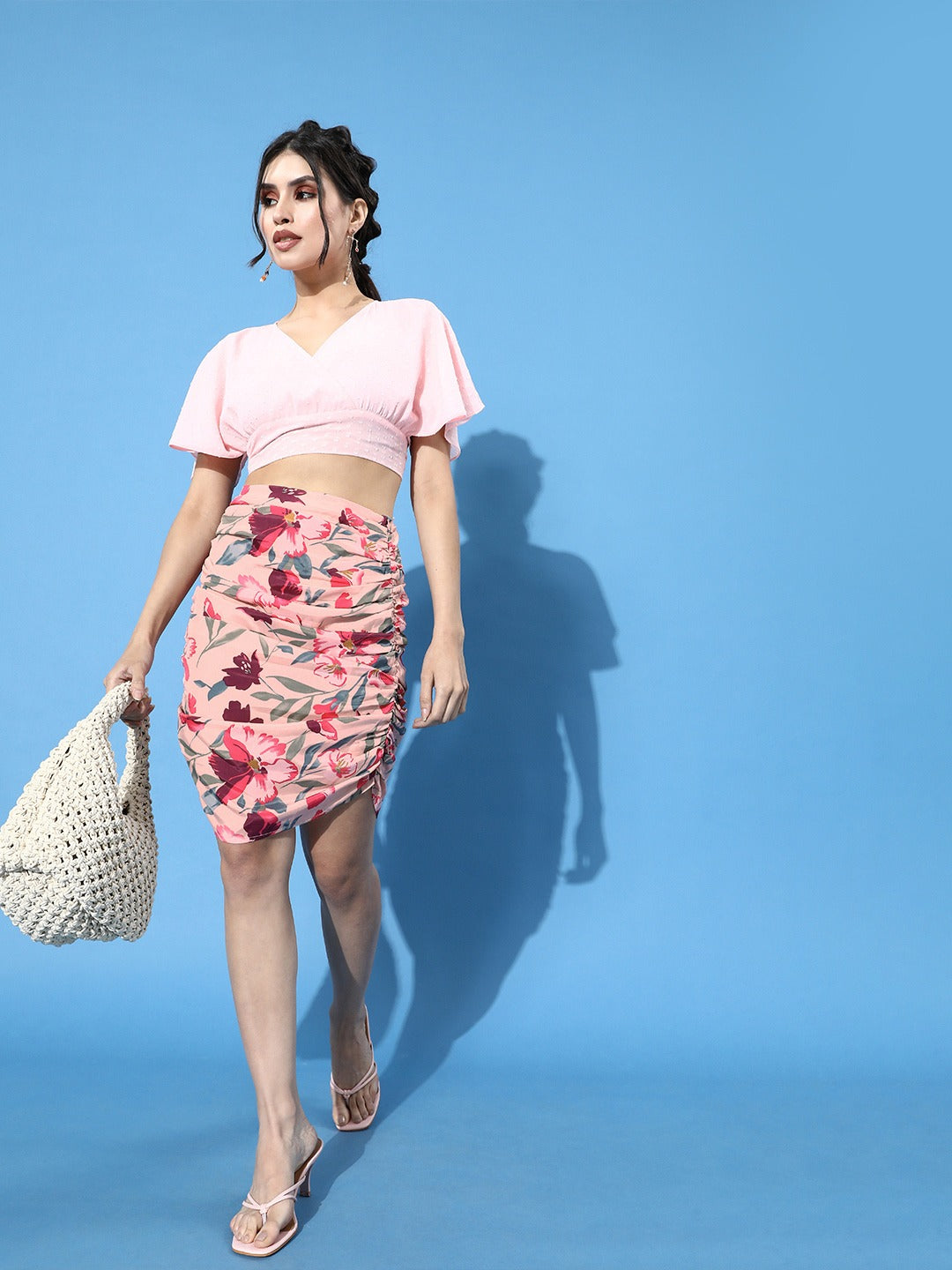 Berrylush Women Pink & Green Floral-Print Ruched Satin Mini Skirt