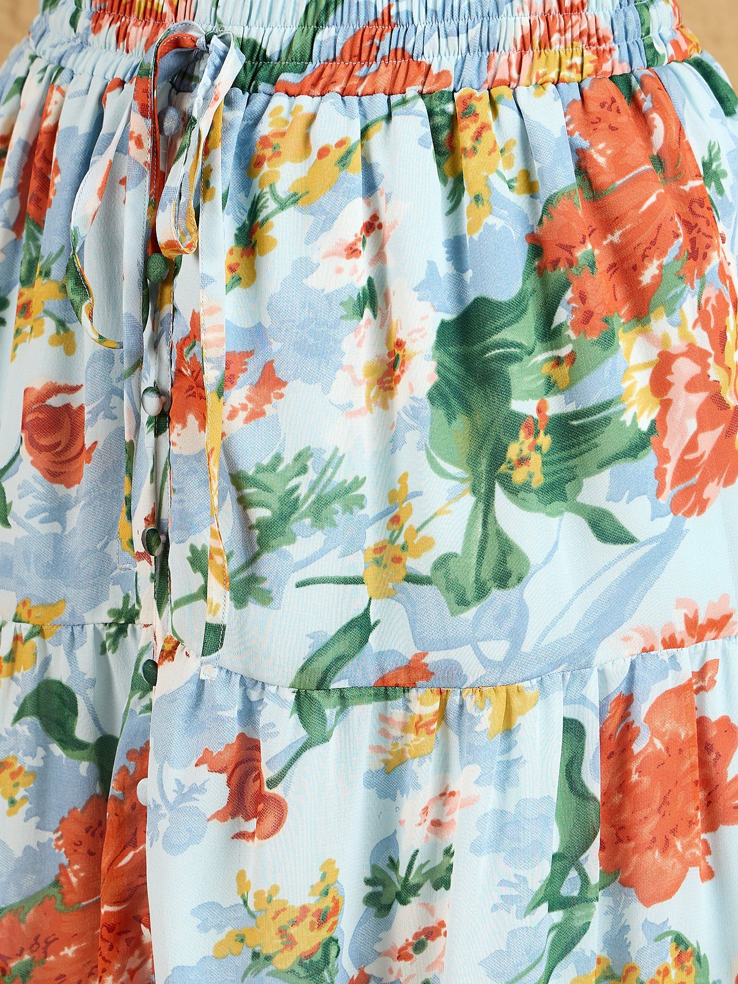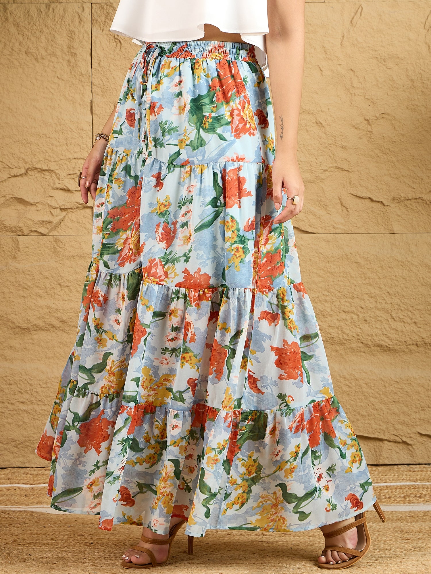 Introducing the Berrylush Blue & Orange Floral Printed Maxi Skirt, a mesmerizing blend of style and comfort that redefines your casual wear. Crafted from high-quality polyester with a woven texture, this A-line skirt showcases a vibrant floral print in striking shades of blue and orange. Its elastic waistband ensures an effortless fit at the high-rise waist, while the front thigh-high slit adds a hint of allure to its flowing silhouette. The gathered surface styling around the flared hemline enhances its elegance, making it perfect for day outings or relaxed evenings alike. Slip into this opaque masterpiece with ease and experience fashion that speaks to your soul.
