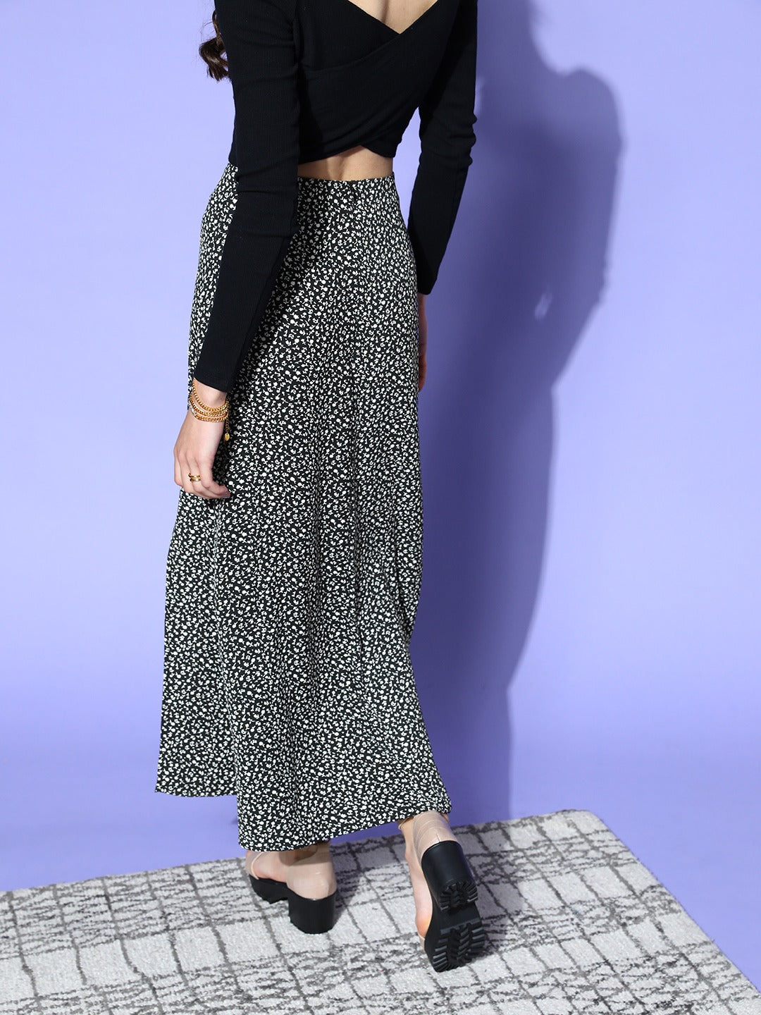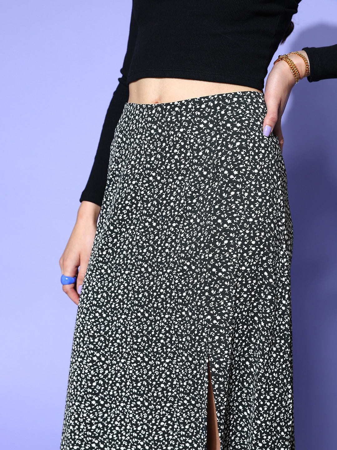Elevate your capsule closet with a classic design accompanied by modern silhouettes just like this charming Black & White Floral Printed High-Rise Waist Side-Slit Flared A-Line Maxi Skirt from Berrylush. Structures with an A-line shape that gets you a figure-defining fit for a flattering appeal with contemporary charm. Prepared from the finest crepe polyester fabric to offer breathability with quick moisture-absorbing ability to this skirt. Comes with concealed zip closure that makes this maxi skirt easy to wear with a clean finish and secure feature. Partner up this maxi skirt with your favourite top, a pair of block heels, tassel earrings, and a stylish handbag to get a fashionable look.