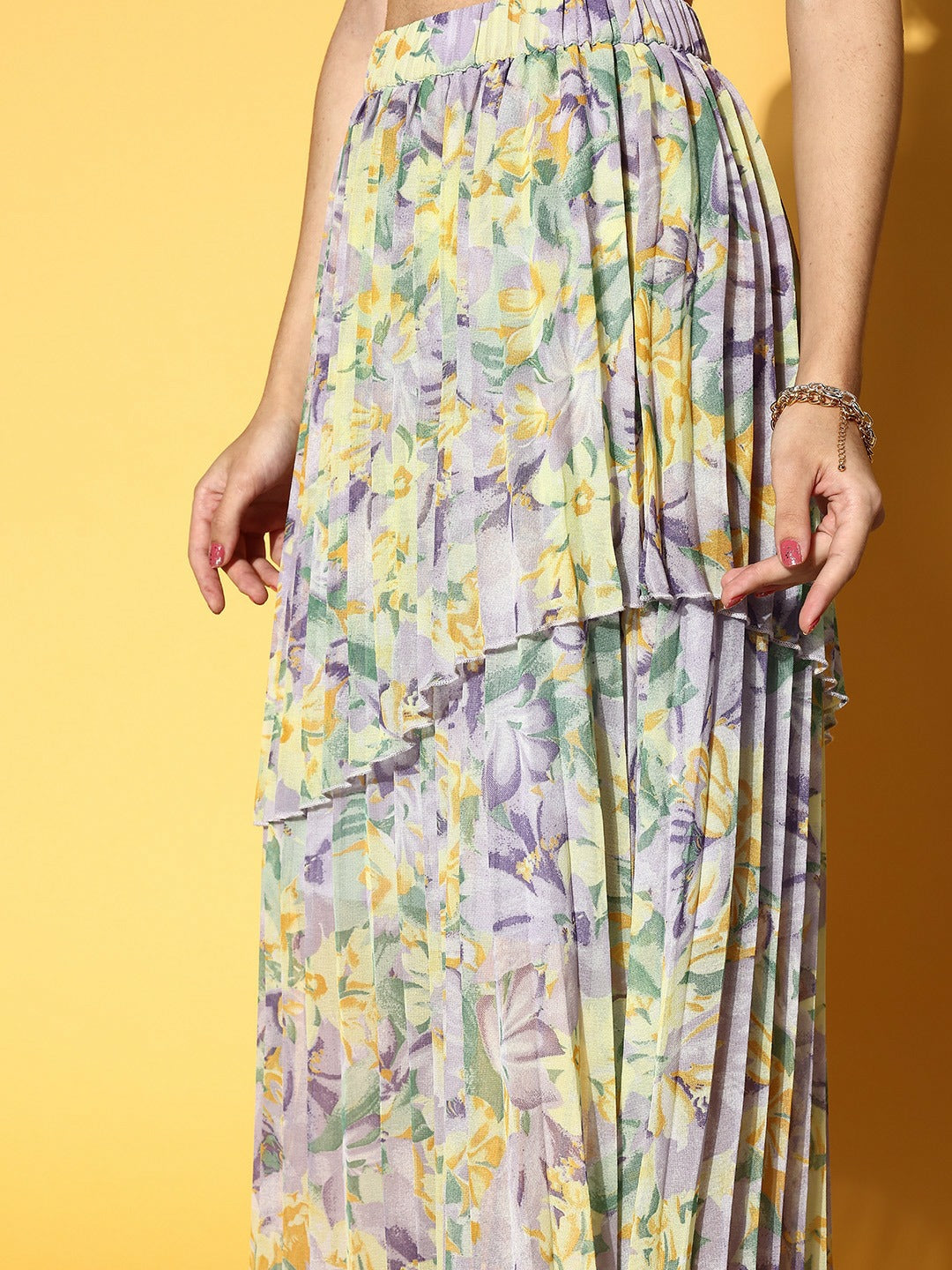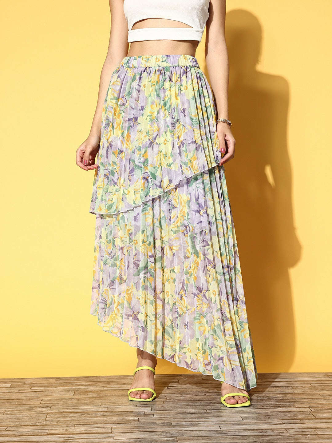 Berrylush Women Purple & Yellow Floral Printed Slip-On Elastic Waist Georgette Pleated Maxi Skirt