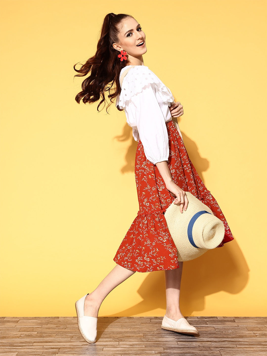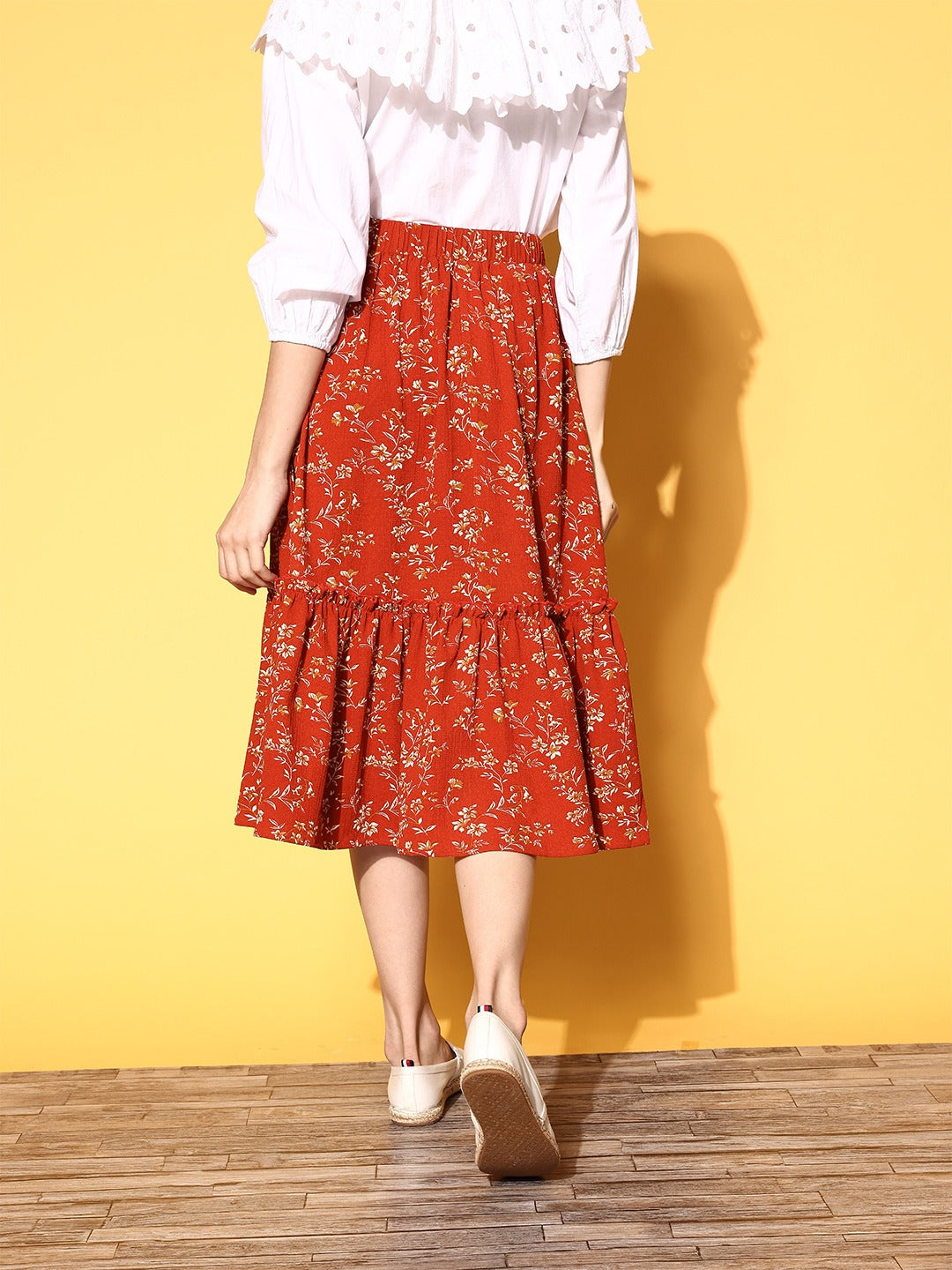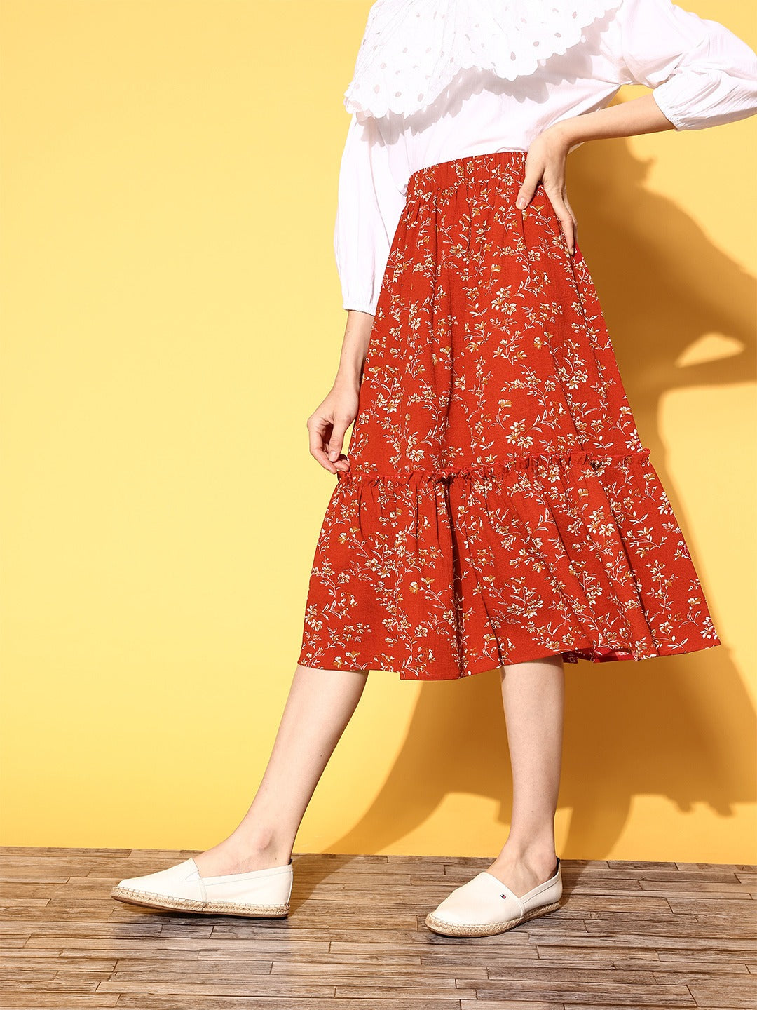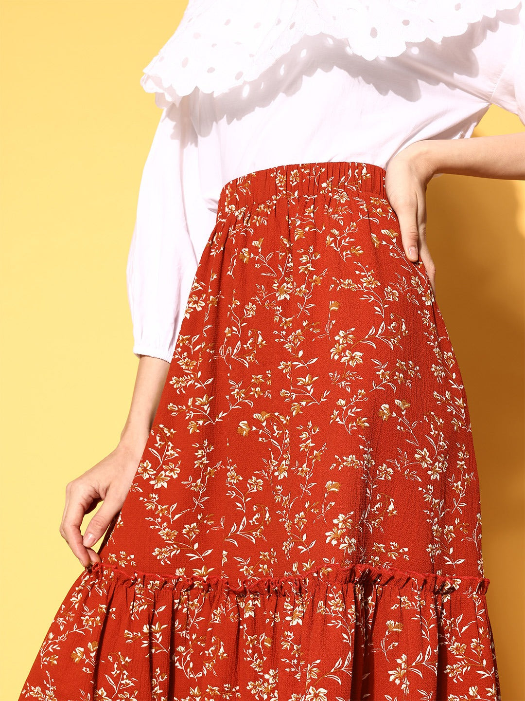 Create a remarkable style statement this season by donning this ravishing Red & Off-White Micro Ditsy Floral Printed Crepe Tiered A-Line Midi Skirt from Berrylush. Sporting a cinematic combination of red shade with lovely off-white micro ditsy floral print which adds gleaming sheen and magical charm to this skirt. Styled with an A-line shape that gives a spotlight to your beautiful curves and the tiered detailing adjoin additional flair and volume to this skirt. Also, this skirt offers total airflow and stain resistance properties as it is made of crepe polyester fabric. Team up this stunning A-line skirt with a Bardot-style top, a pair of ballets, and an adorable side bag to create a fashion-flattering look.