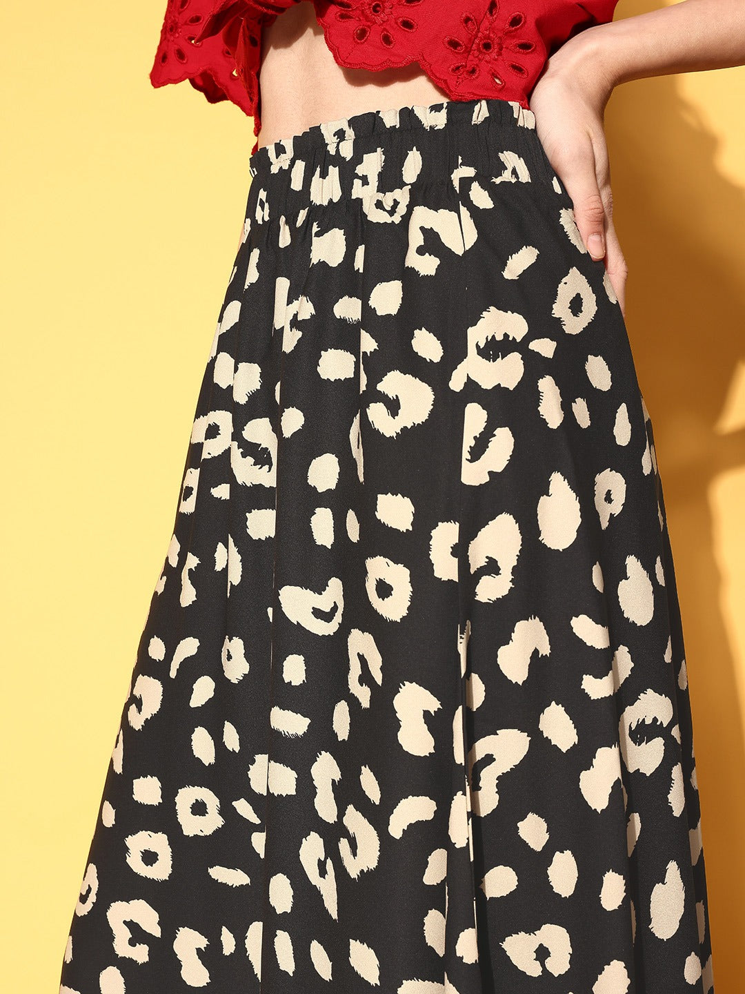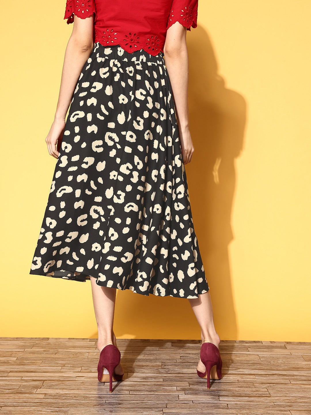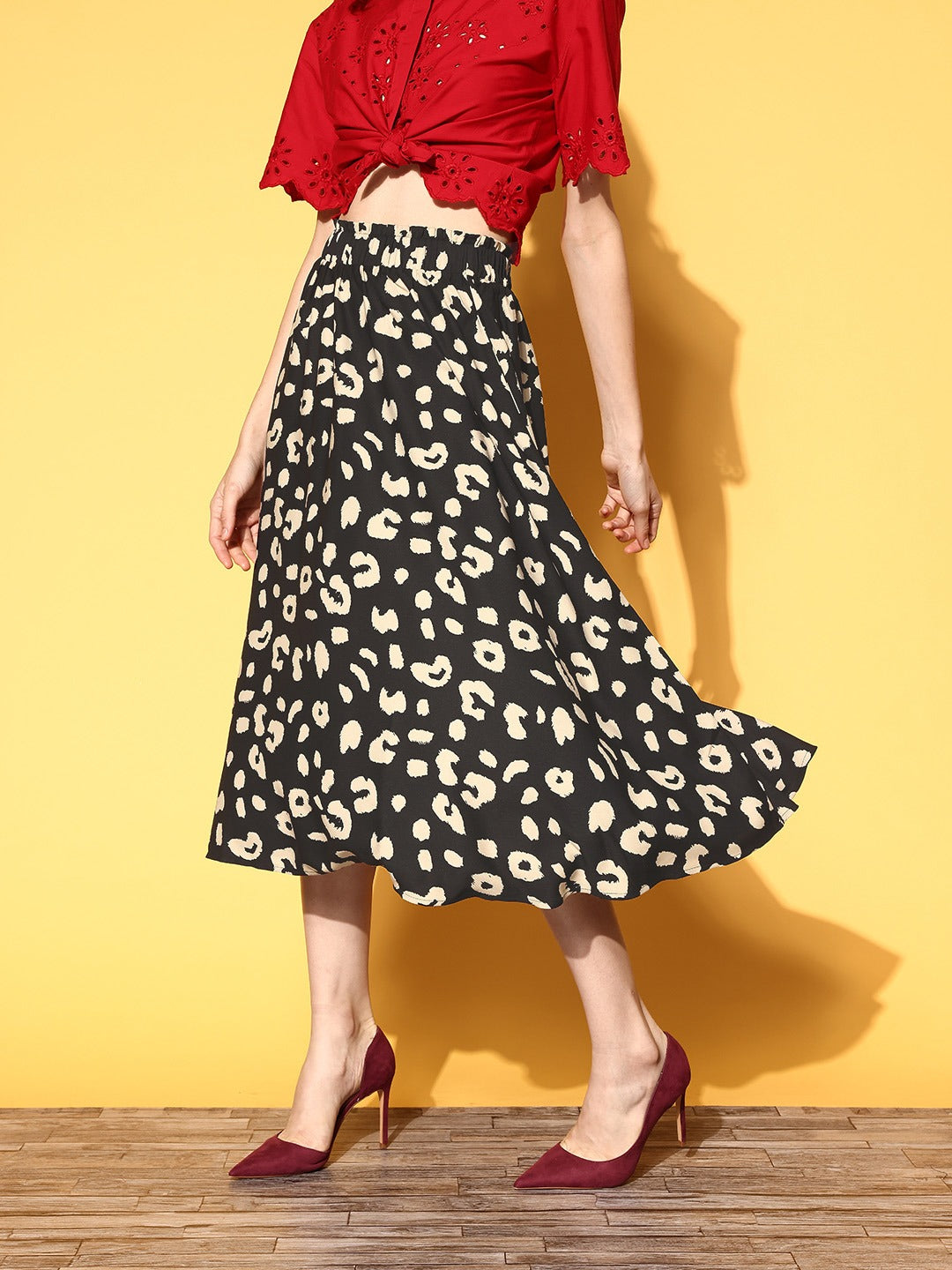 Be a trendsetter this season by introducing this chic Black & Cream Animal Printed Crepe Flared A-Line Midi Skirt designed by Berrylush. This skirt enables you to capture your body shape uniformly with its A-line shape while the maxi length gets you a modest and elegant appeal. Features slip-on closure for easy-to-wear style as this skirt is designed with an elasticated waistband that provides a convenient silhouette. The amusing amalgam of black shade with cream animal print put forward an eccentric style that gives away a passionate vibe. Pair up this amazing A-line skirt with a red shirt-style top, a pair of classy heels, and a stylish handbag to get a fashionable look.