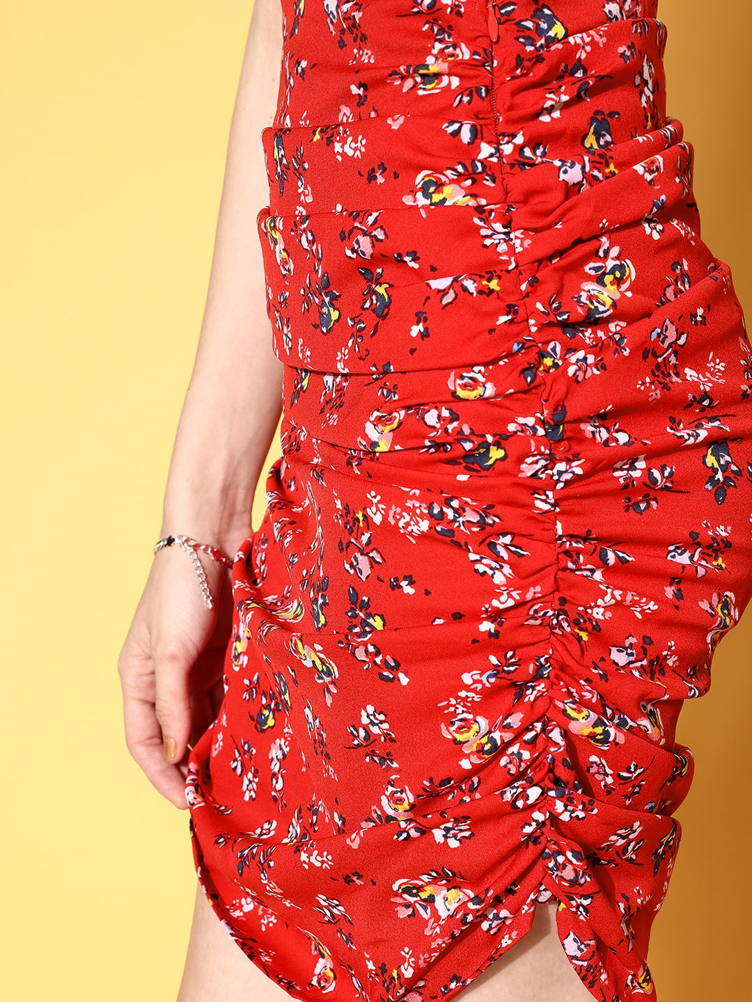Berrylush Women Red & White Floral Printed High-Rise Waist Ruched Pencil Mini Skirt