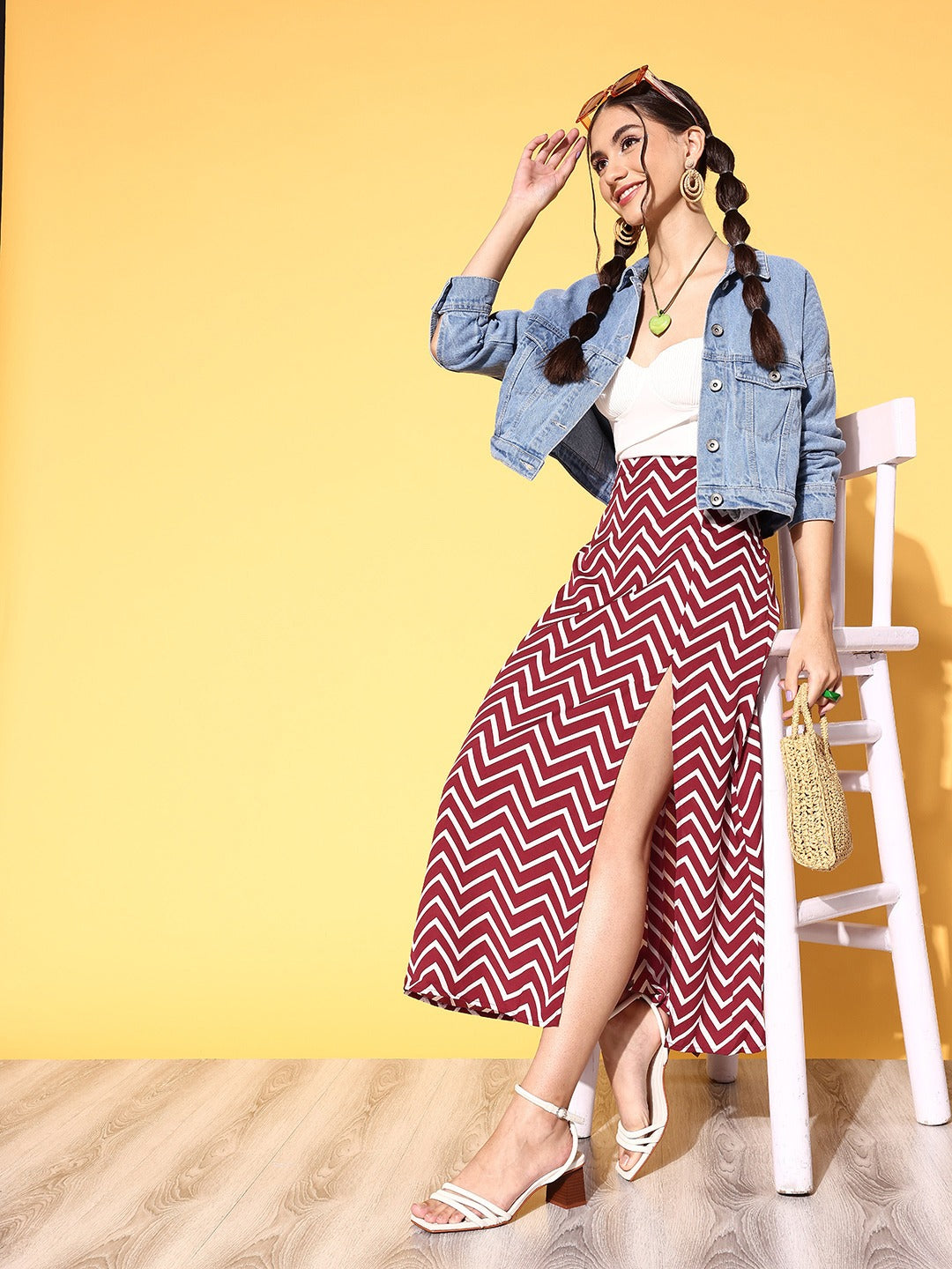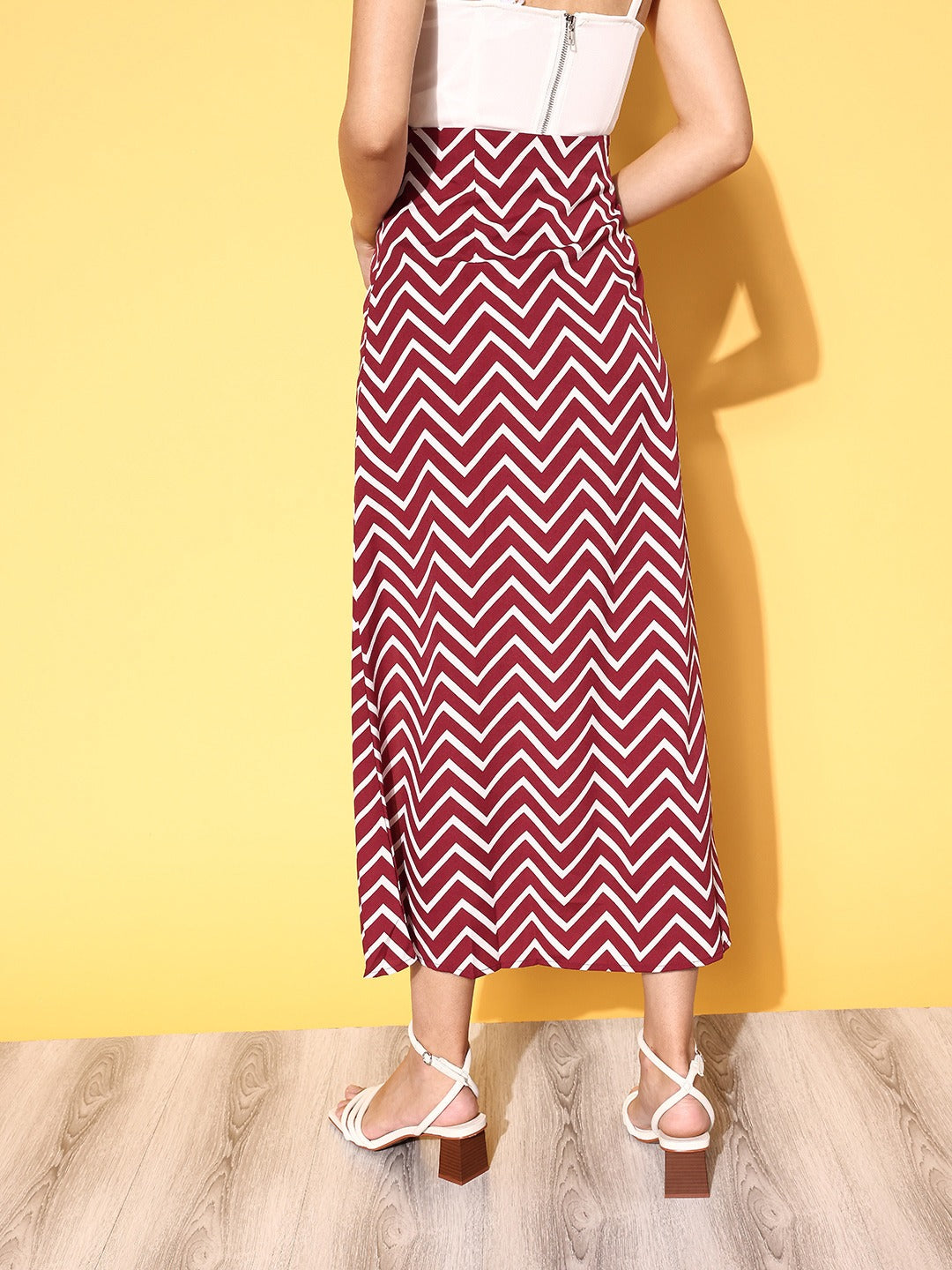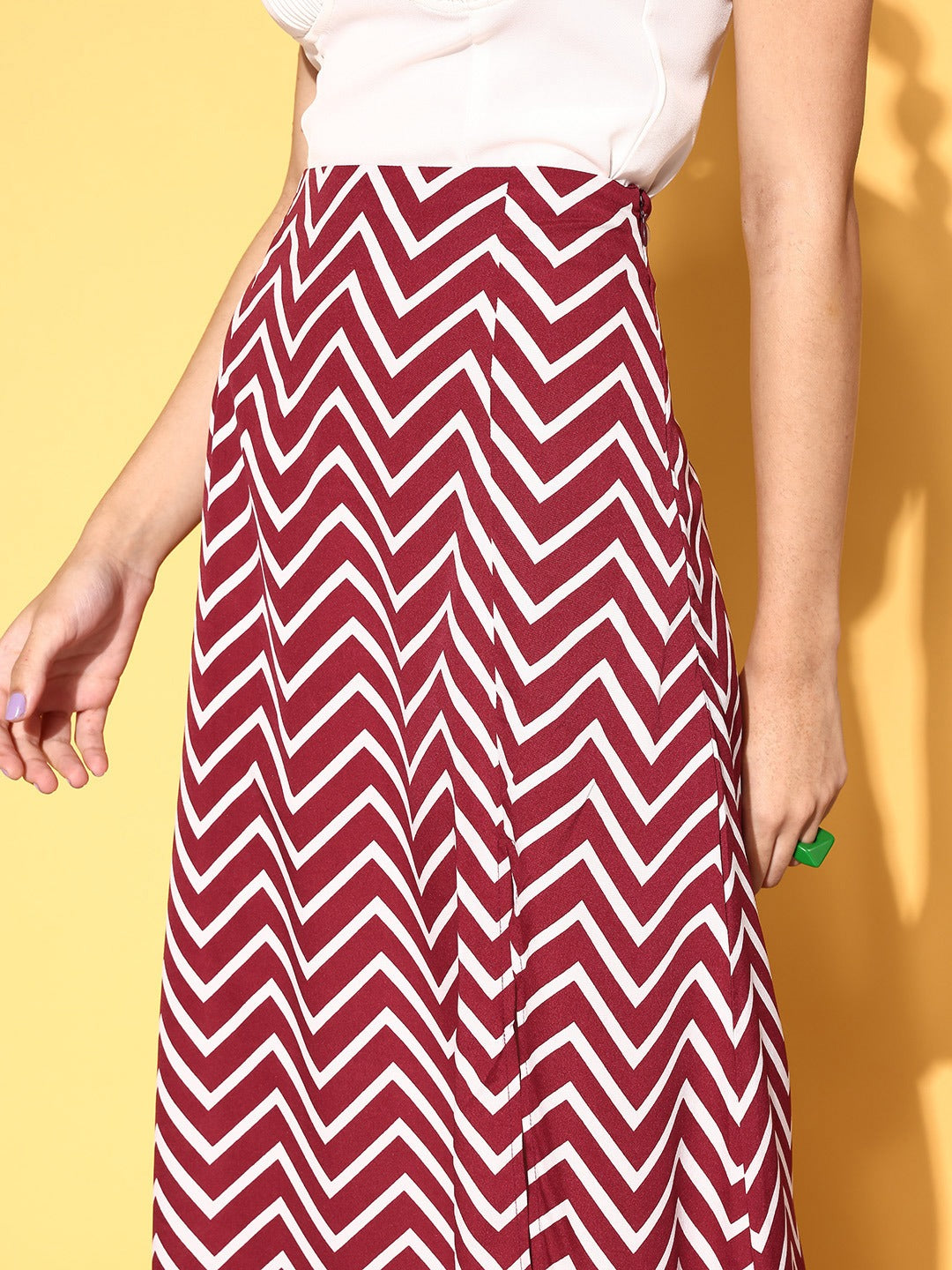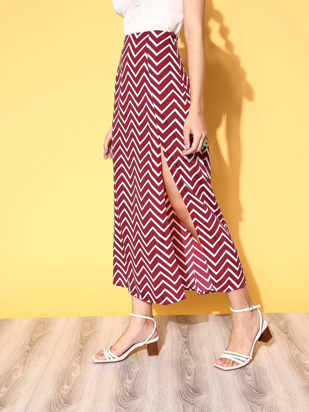 Berrylush Women Maroon & White Chevron Printed Thigh-High Slit Flared A-Line Midi Skirt