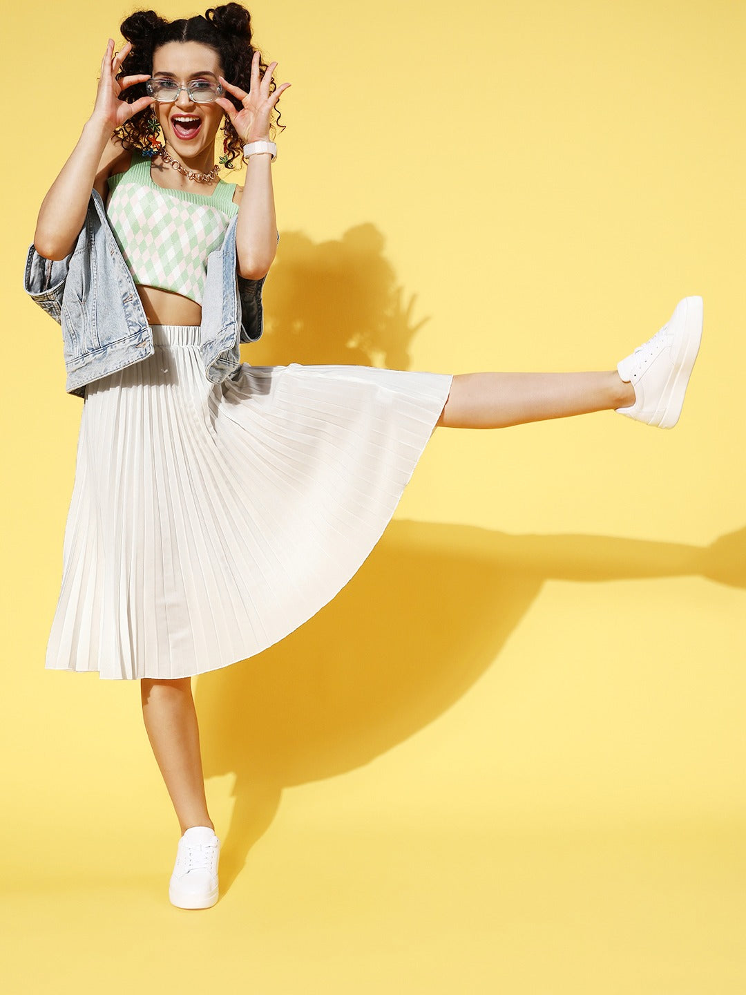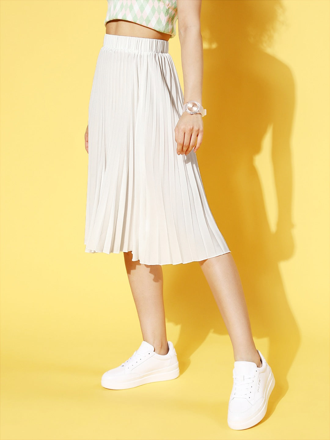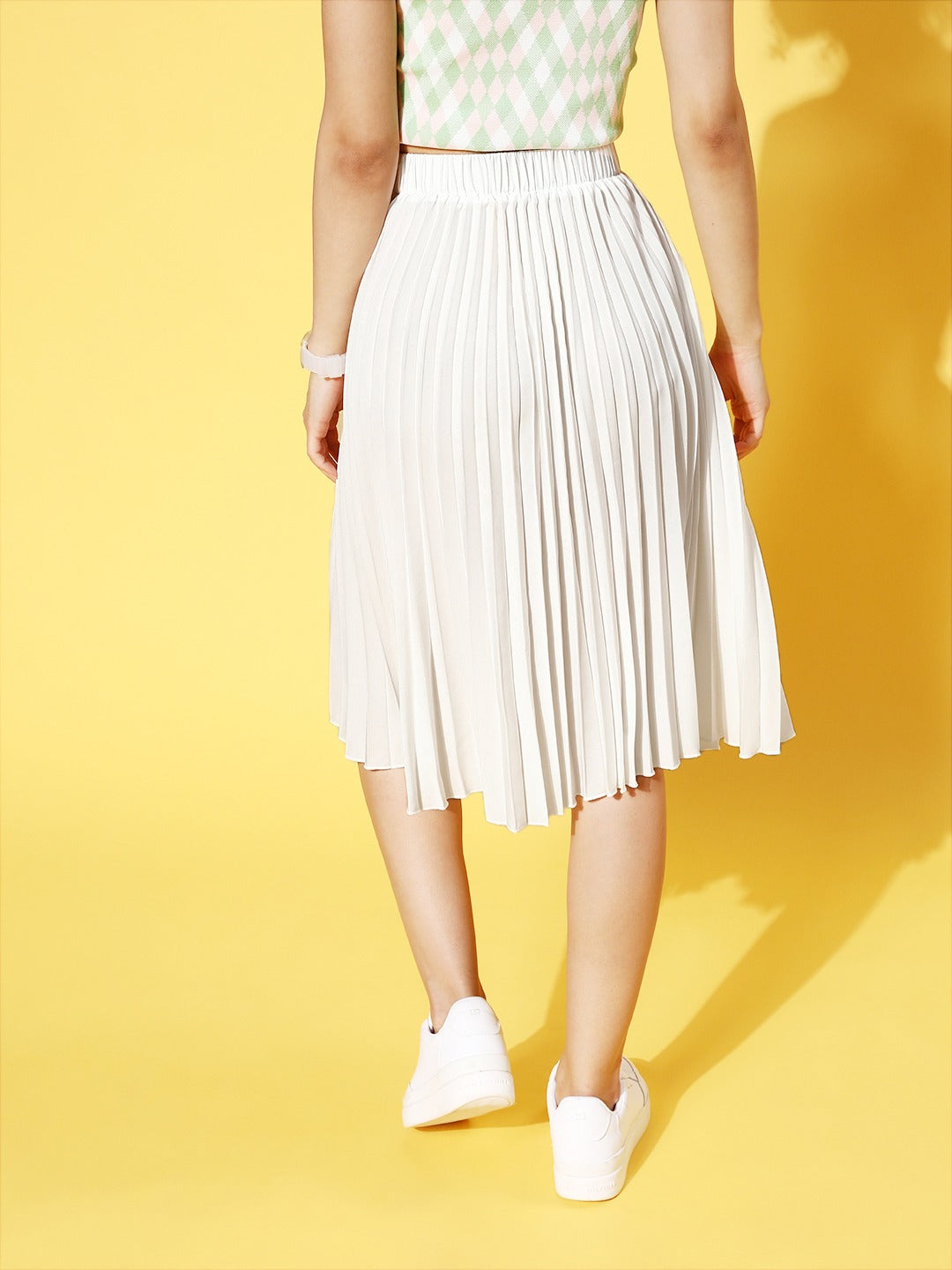 Opt for a show-stopping style statement for your capsule assortment with the addition of this opulent Off-White Solid Accordion Pleats A-Line Midi Skirt from Berrylush. The most adorable fashion aspect of this skirt is the beautiful amalgam of off-white shade and solid pattern that put together a classic design. The midi length makes this skirt an appropriate option to wear for any occasion by lending you a sophisticated look. Spun from the finest crepe polyester fabric that offers this skirt amazing resistance from water-based stains and wrinkles. Team up this midi skirt with a contrasting crop top, a pair of white sneakers, and a cute side bag to create a playful appearance for your weekend outing.