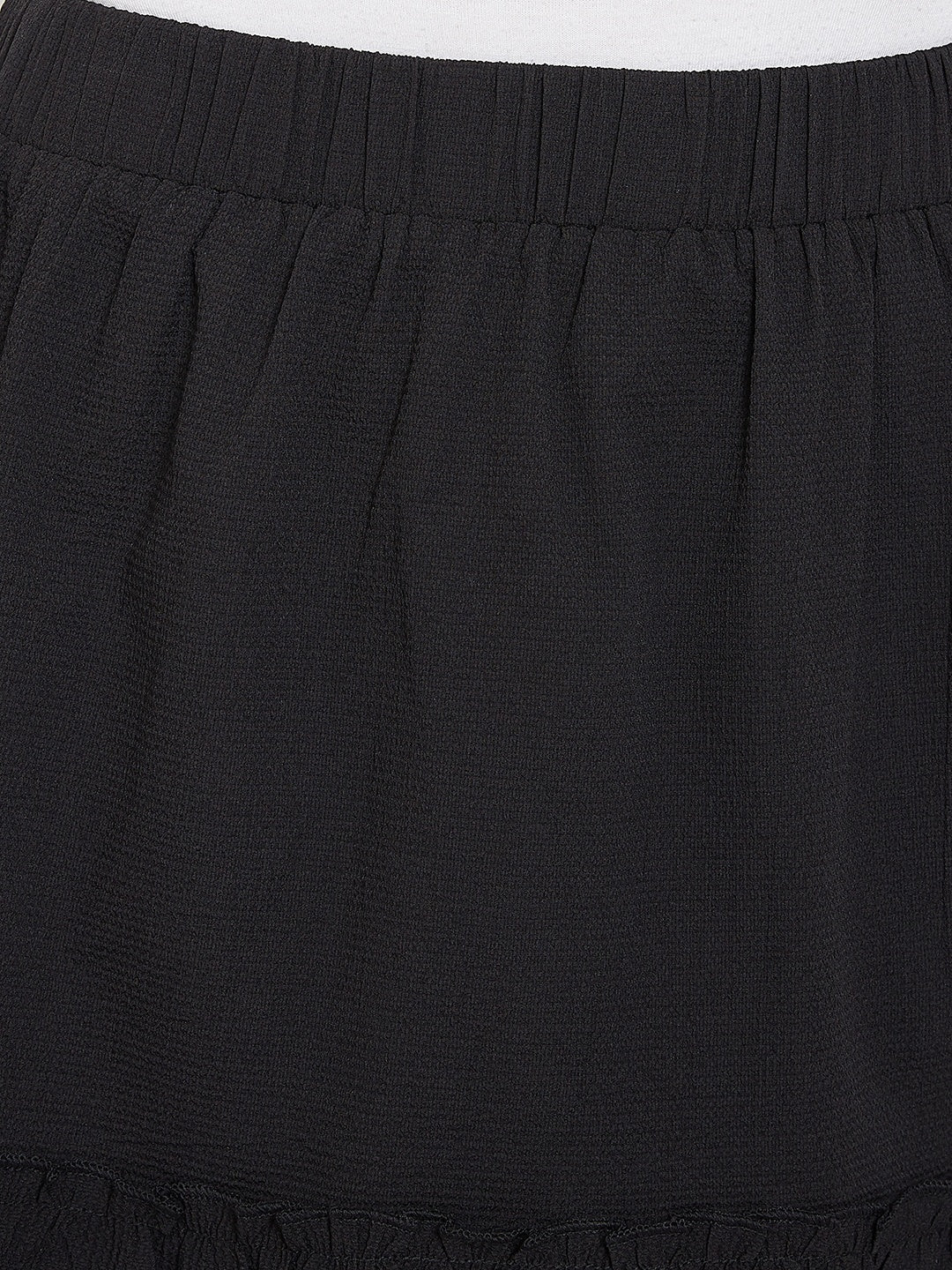 Make a style statement this party season with this Solid Black Cut-Work Slip-On Flared Mini Skirt from Berrylush. This skirt creates seductive appeal to your look with its mini length and semi-sheer transparency. Designed with flared hemline with cut-work on the hem gives a dazzling and fascinating finish to your look. The elasticated waistband gives good posture and wearing ease while the pleated surface styling offers a delicate textured finish. The woven stitch of the skirt with crepe polyester fabric gives smooth touch with charming flaunts. Team up this skirt with a fitted top and high-heels to look picture perfect.