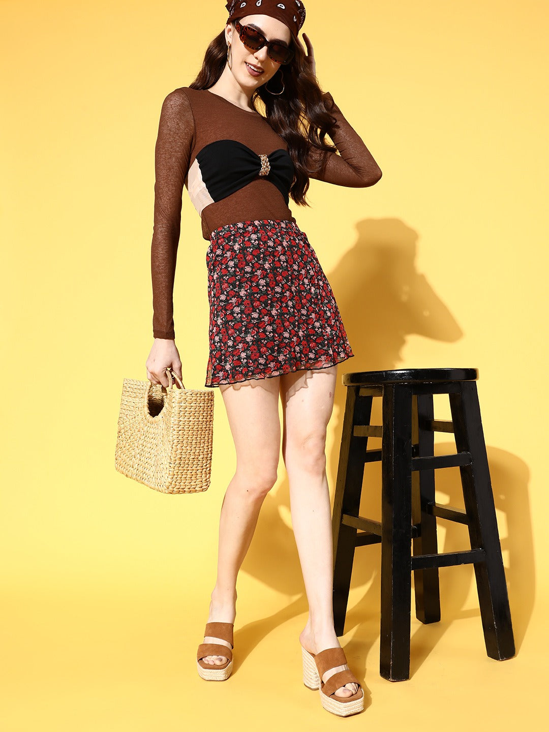 Berrylush Women Black & Red Floral Printed Straight Hem Slip-On A-Line Mini Skirt