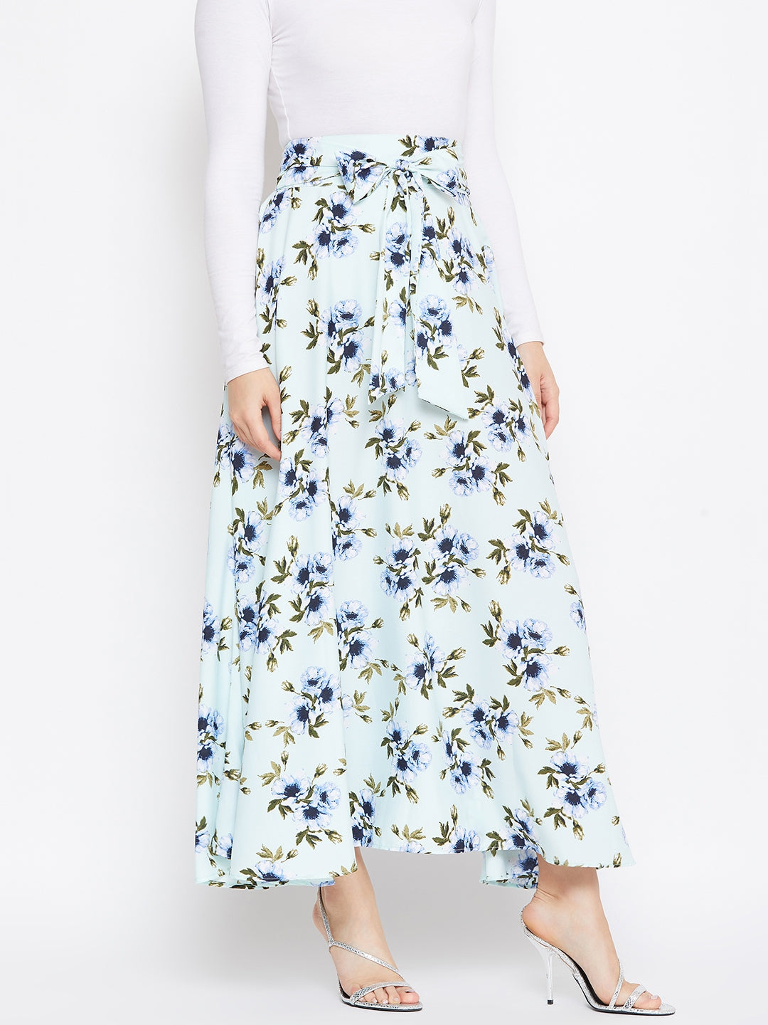 Berrylush Women Green Floral Printed Flared Tie-Up Maxi Skirt