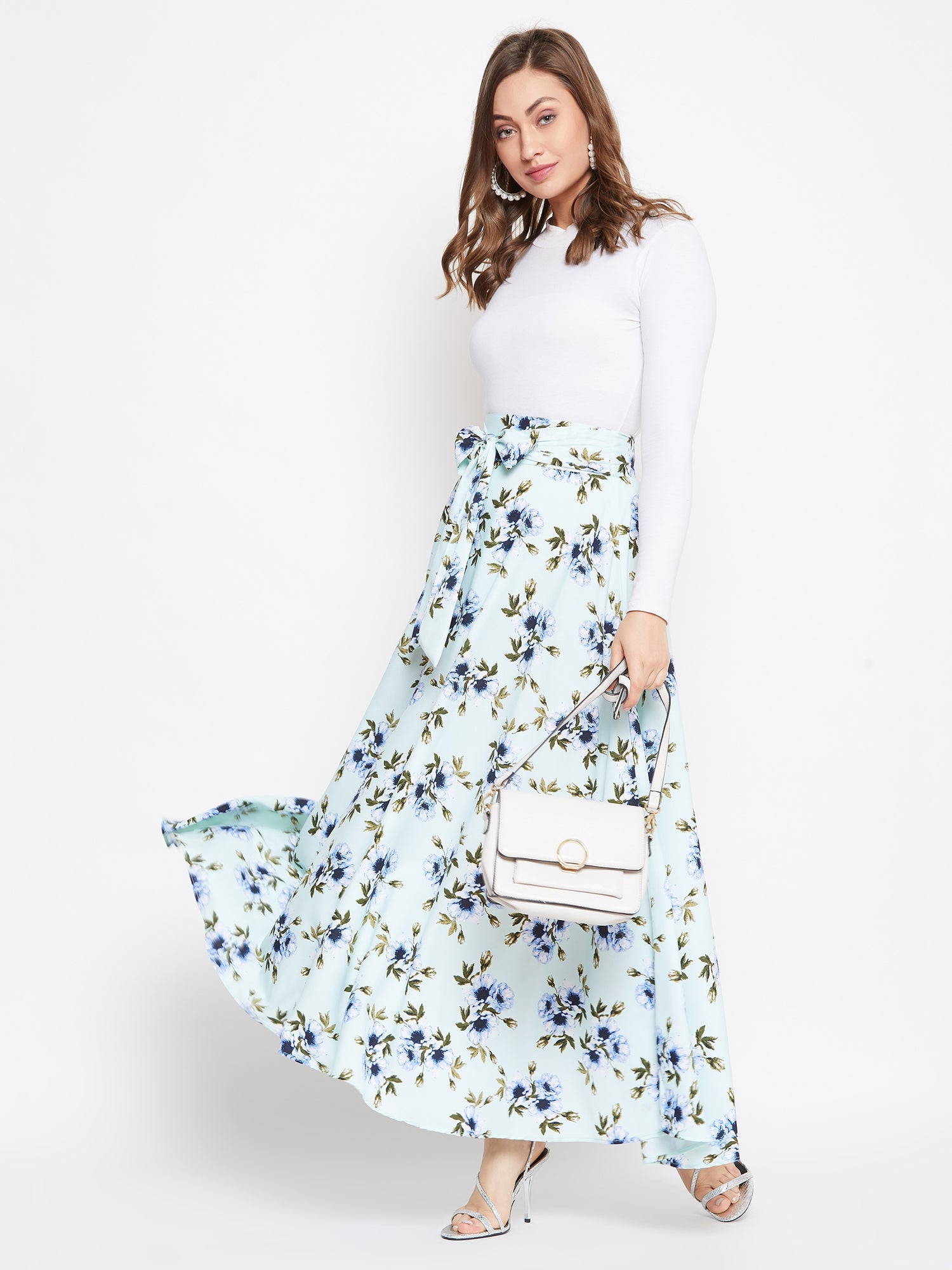 Berrylush Green Floral Printed Flared Tie-Up Maxi Skirt appears to be a bespoke garment that is suitable for every type of figure. The presence of pastel green shade and the fascinating floral work throughout the body of the polyester fabric, looking like a canvas painted with wonderful scenery. To further stretch the taller outline for you the designer has emphasized the silhouette to be an A-lined one. The waistline gets a smarter look with the captivating front tie bow and the fitted band over the waist. "Every outfit should create an unmatched trend"; likewise, to follow this notion you just need to add a medium heeled stiletto and a mini clutch bag. Buy this trendsetting outfit from Berrylush and set new ideas of fashion before the world.