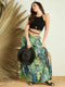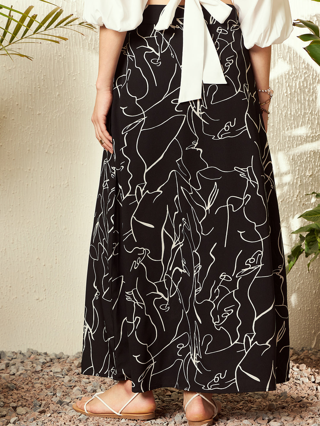 Berrylush Women Black & White Abstract Printed High-Rise Waist Zipper-Up Straight Hem Thigh-High Slit A-Line Maxi Skirt