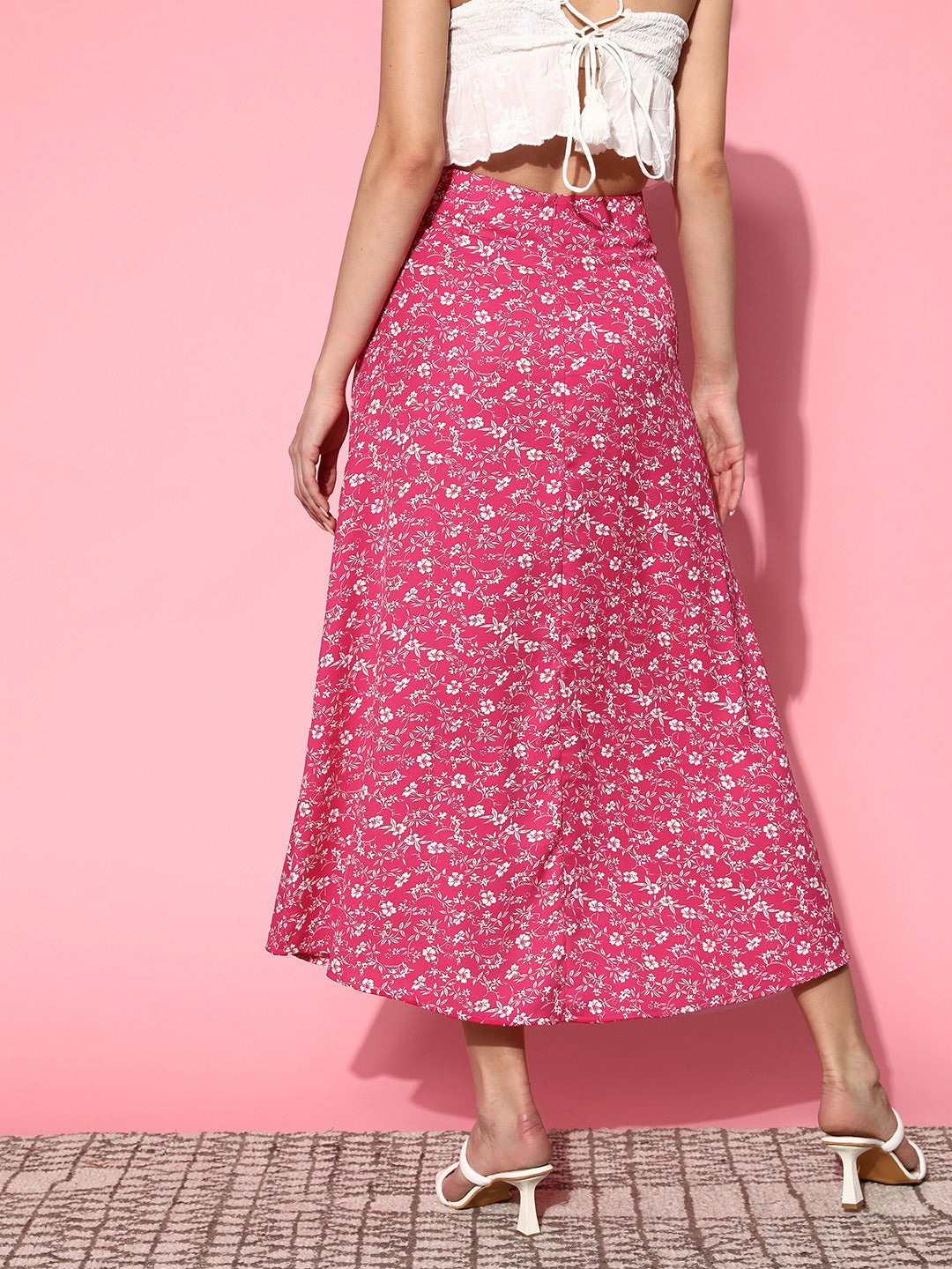 Berrylush Women Pink & White Floral Printed High-Rise Waist Side-Slit Flared A-Line Maxi Skirt