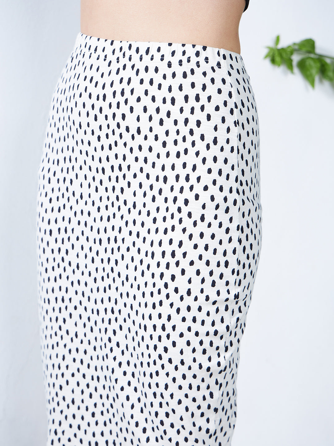 Berrylush Women Beige & Black Stroke Dot Printed Elastic Waist Cotton Blend Back-Slit Straight Hem Knitted Midi Skirt