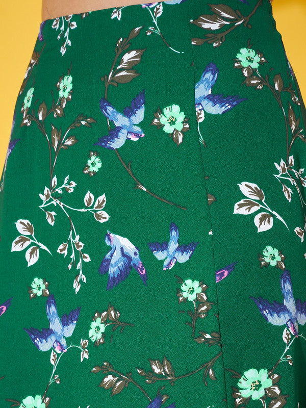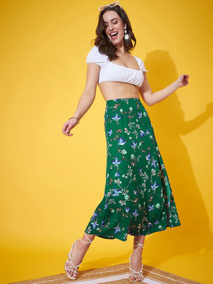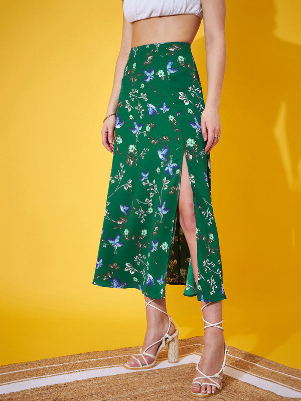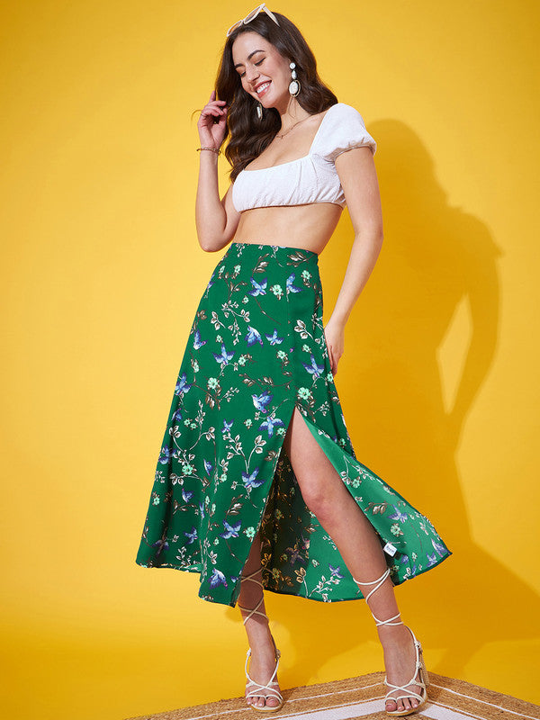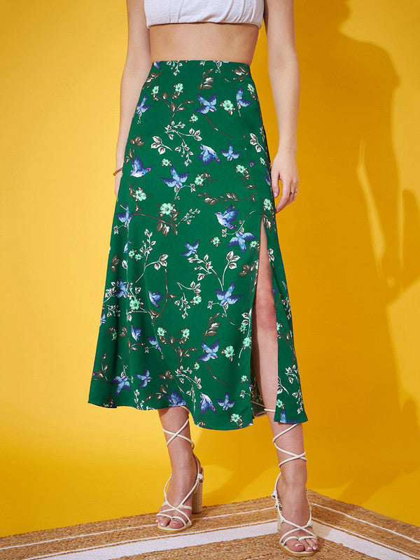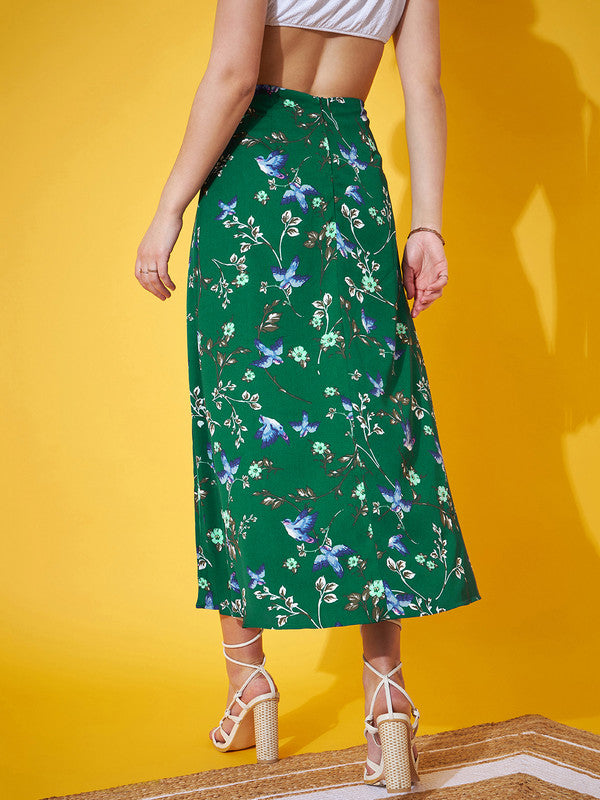 Berrylush Women Green & Blue Floral Printed High-Rise Waist Straight Hem Thigh-High Slit A-Line Maxi Skirt