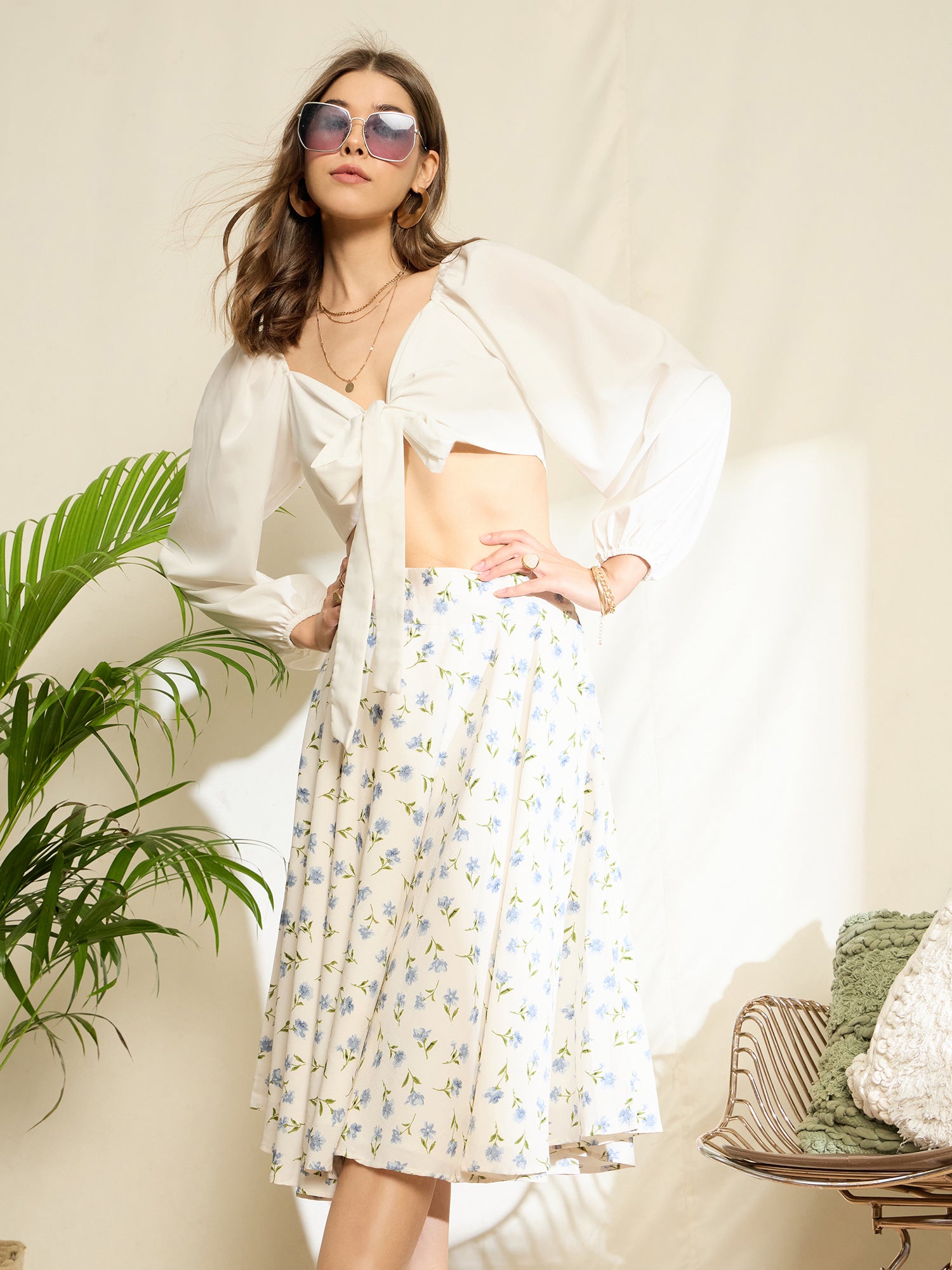 Berrylush Women White & Blue Floral Printed High-Rise Waist Slip-On Pleated A-Line Midi Skirt