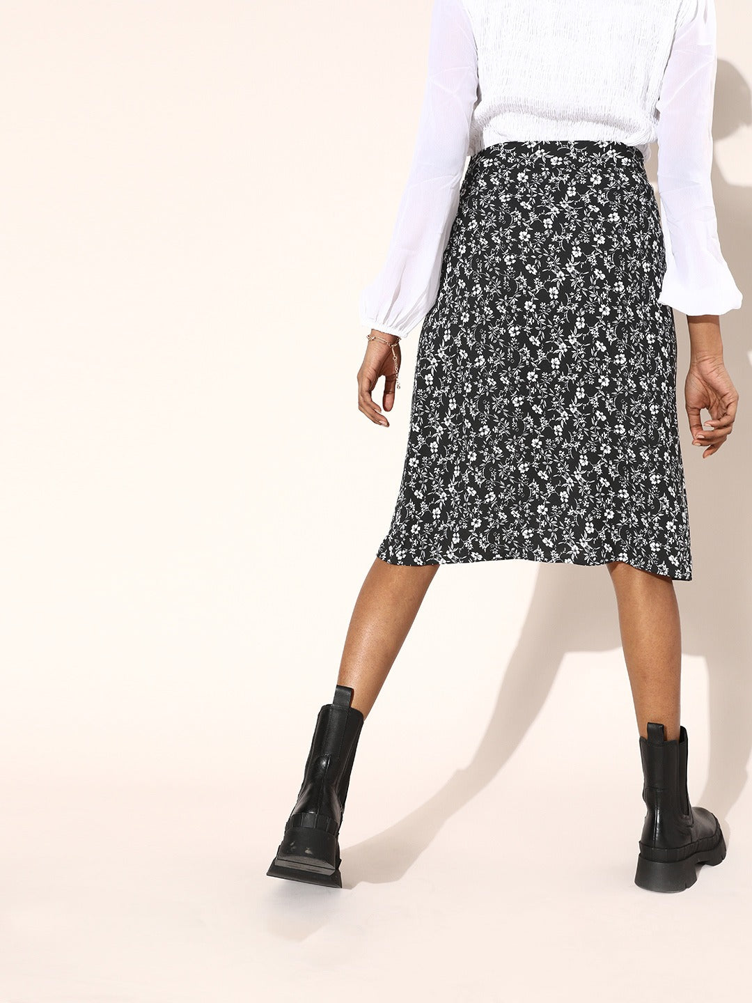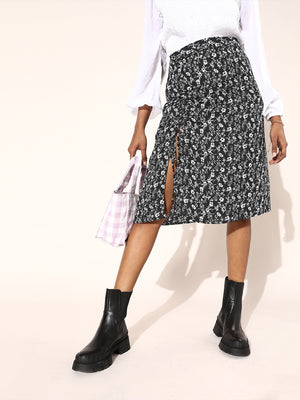 Berrylush Women Black & White Ditsy Floral Printed Thigh-High Slit A-Line Midi Skirt
