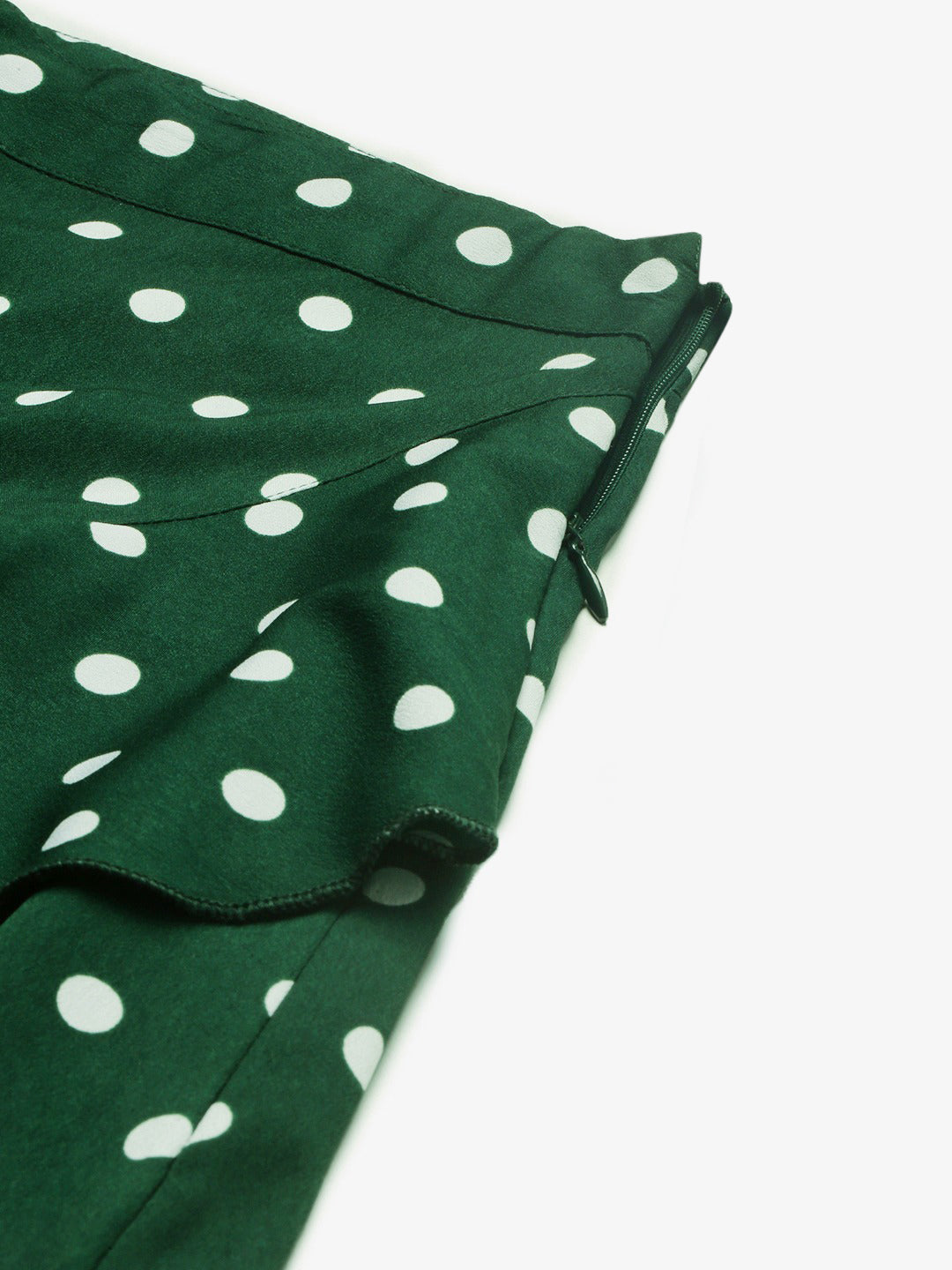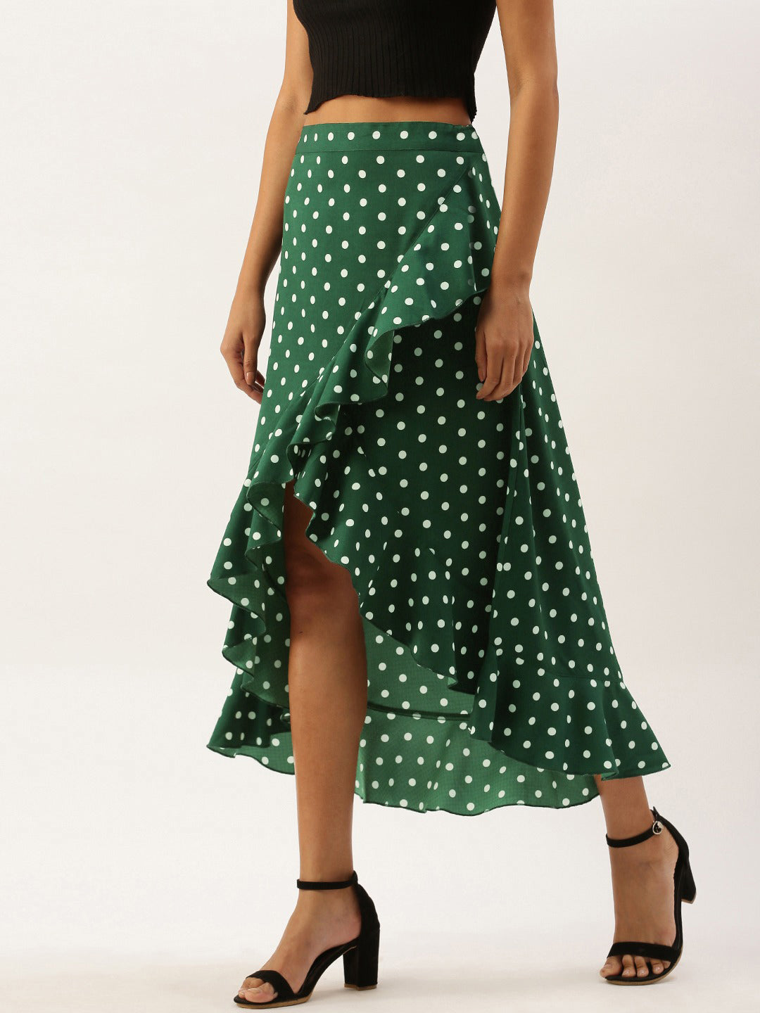 Berrylush Women Green Polka Dot Asymmetrical Hem Ruffled Wrap Skirt