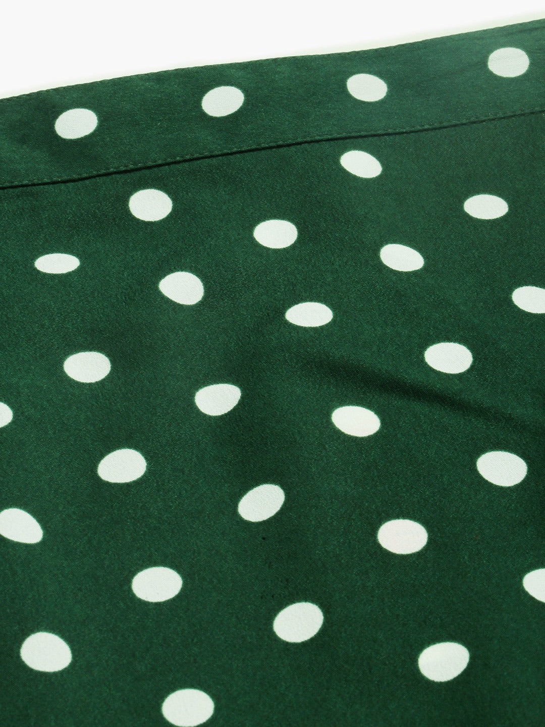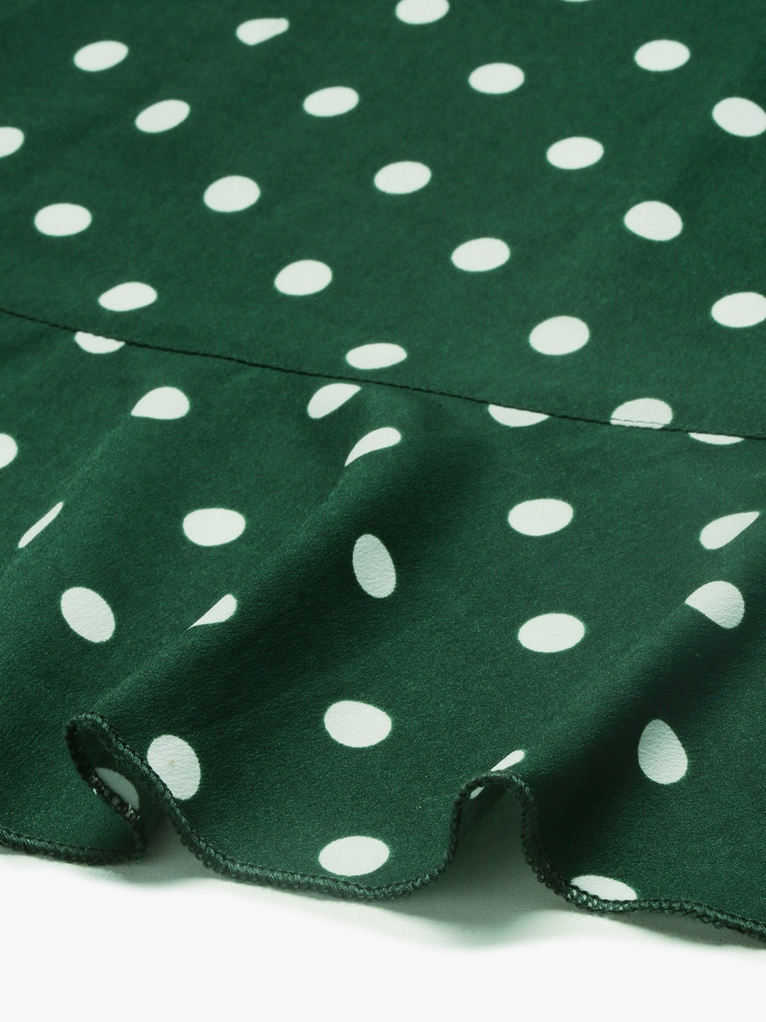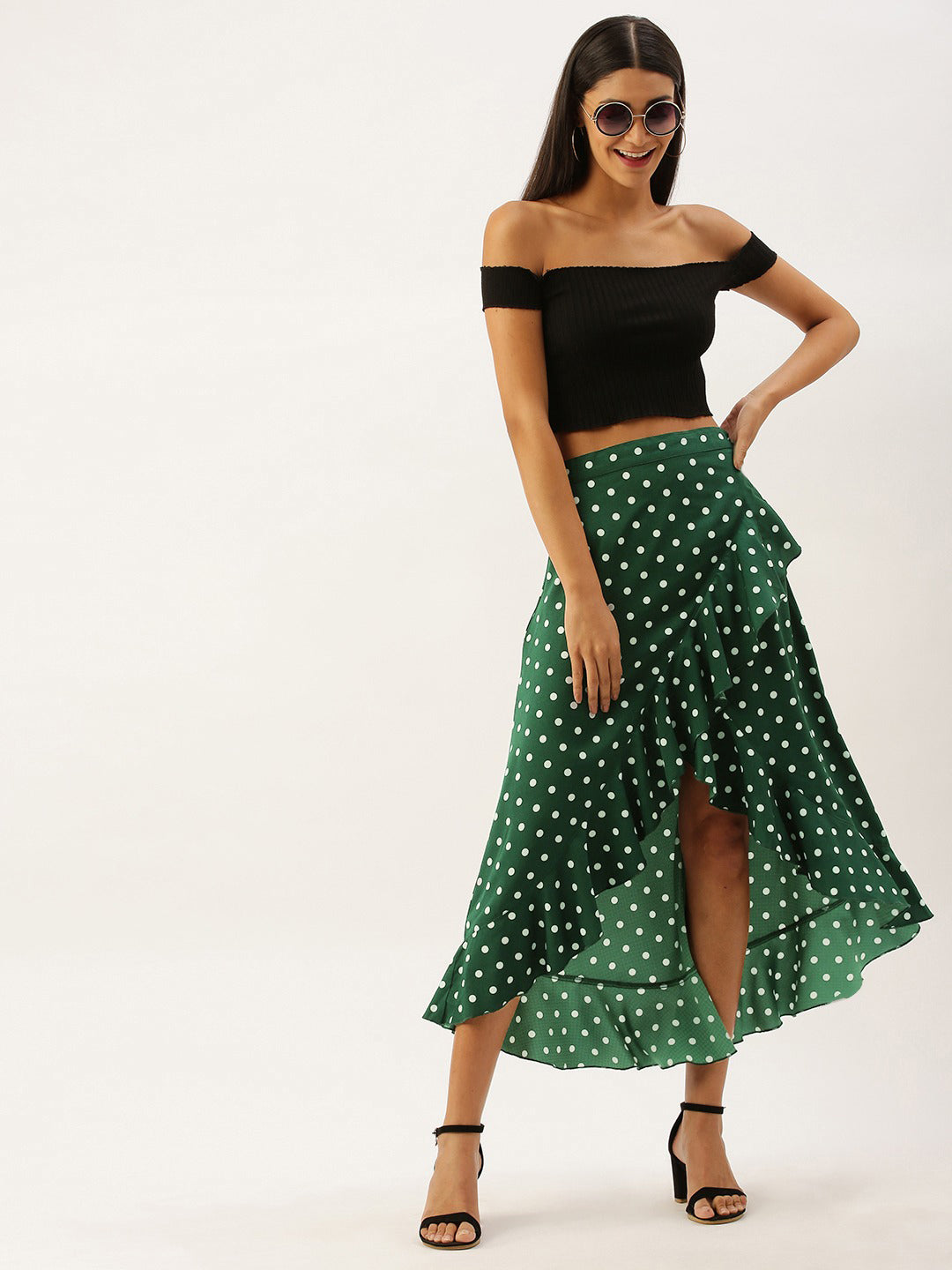 Live in the youthful essence of this Green Polka Dot Asymmetrical Hem Ruffled Wrap Skirt from Berrylush and decorate your casual look. Bring a fresh fashion style with this criss-cross asymmetric ruffled design of this skirt. With the banded waist, this skirt beautifully stylizes your waistline and the midi length serves the pure purpose of making your wearing experience weightless. The charming white polka dot pattern helps you to attain the ultimate chic look. The wrap detailing and A-line design of this skirt illuminate an attractive silhouette. Pair this bright skirt with strappy heels and a floral crop top for a captivating appearance. Buy this amazing green polka dot skirt from Berrylush and bring the stunning street style.