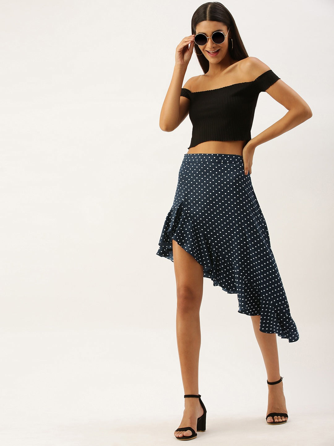 Bring out your charming vibes everywhere you go with this Navy Blue Polka Dot Asymmetrical Hem Ruffled Skirt from Berrylush. The high-end style of the polka dot pattern, designed over this pretty skirt adds a spectacular spark to your casual outfit. The banded waistline creates a fashion-triggered tucked-in effect. The asymmetric ruffle design serves the purpose of adding spice to your overall appearance. The polyester fabric helps to carry this outfit in a weightless manner and the zipper closure smartly takes care of the support element to your look. Style this stunning skirt with a black coloured crop top and strappy heels and create a new fashion code.