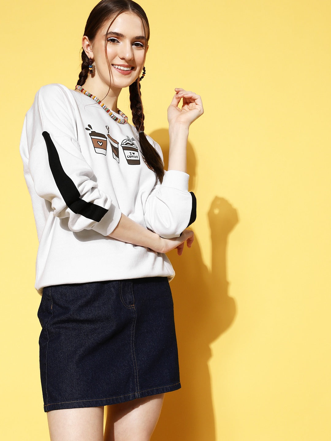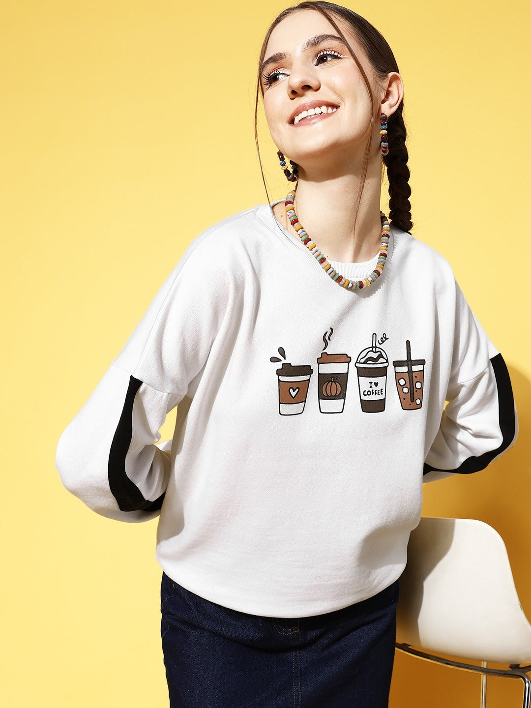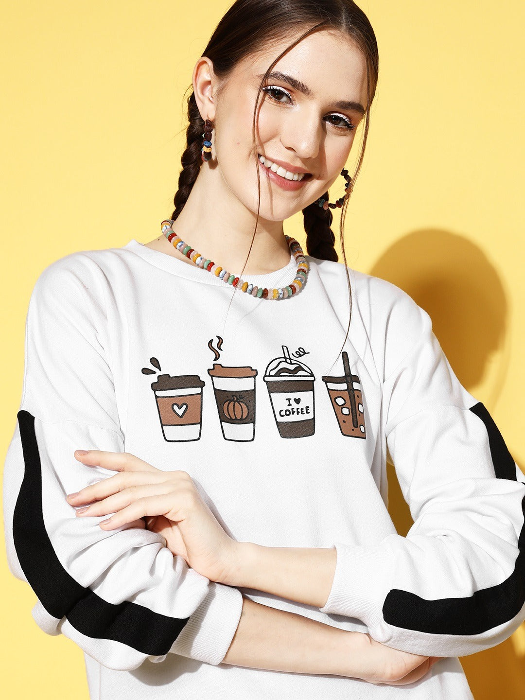 Berrylush White Coffee Printed Round Neck Ribbed Pullover Regular Sweatshirt
