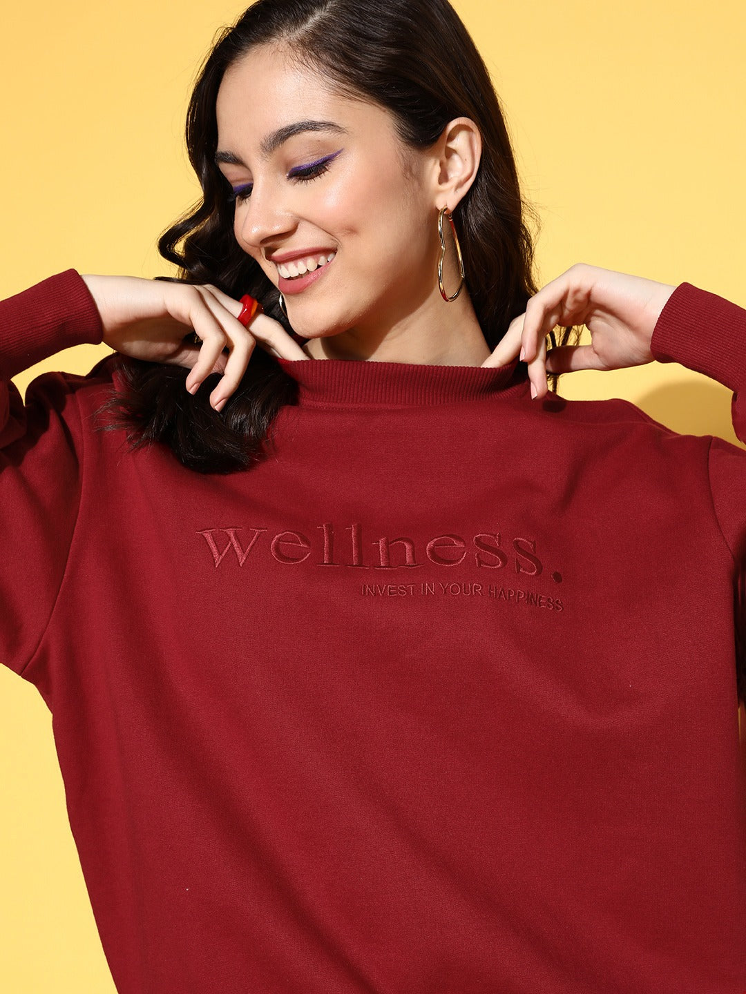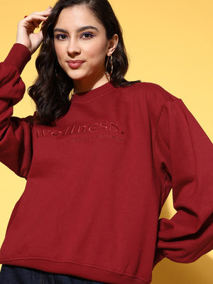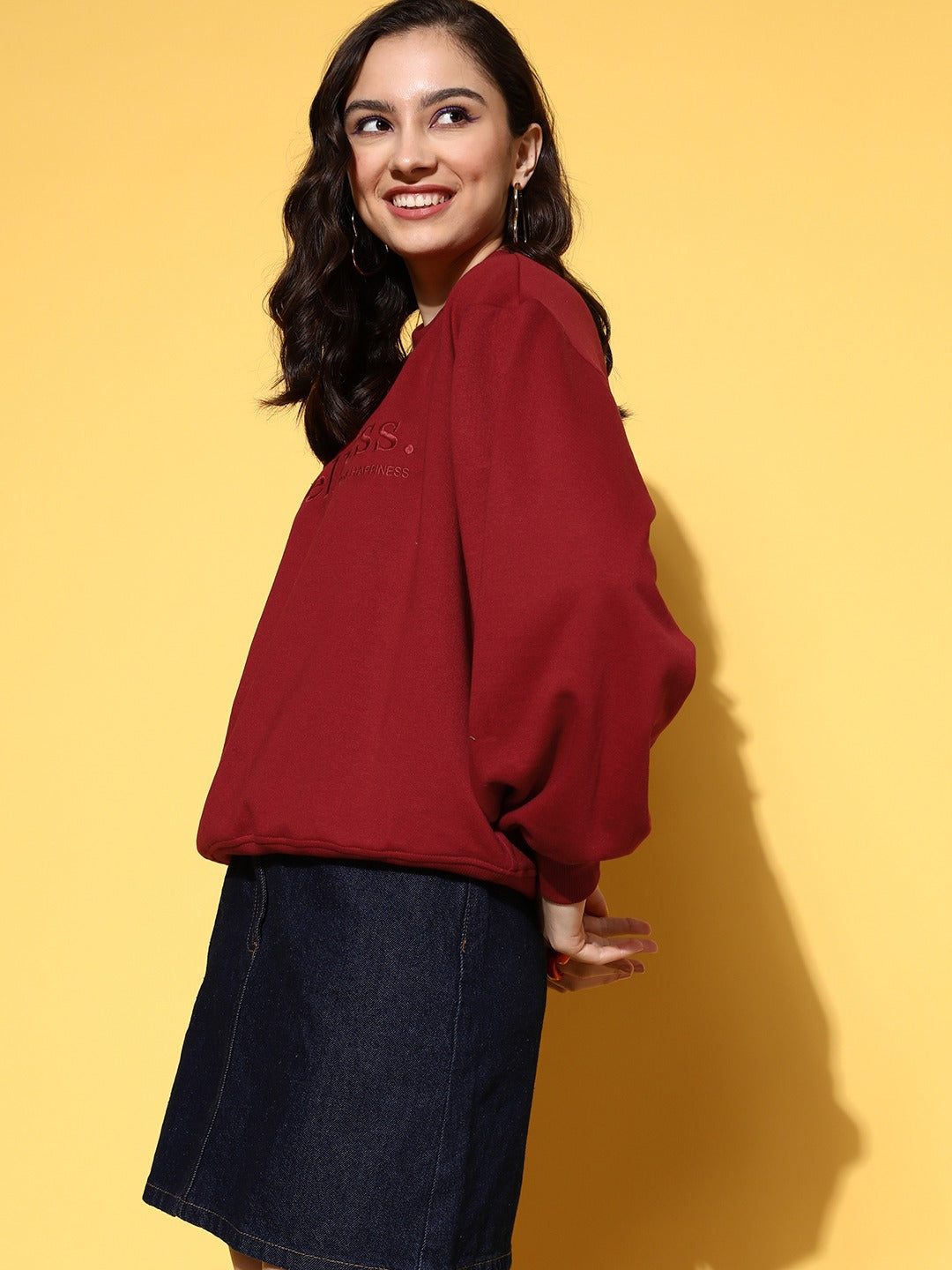 Berrylush Women Maroon Typography Printed Round Neck Ribbed Pullover Regular Sweatshirt