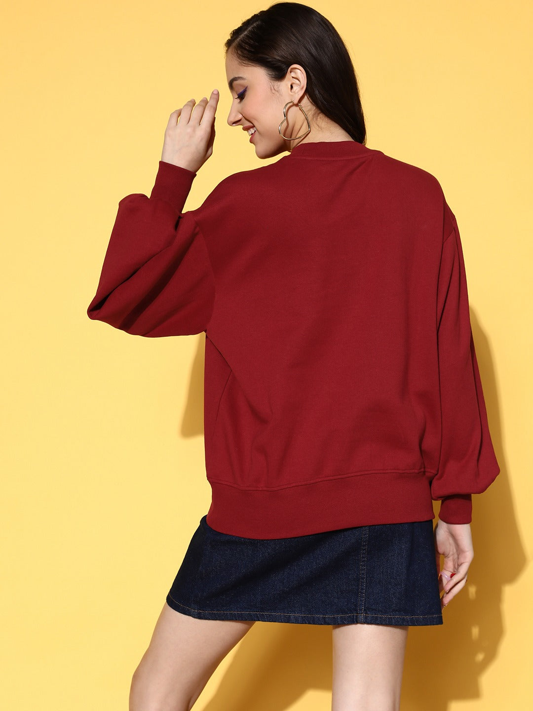 Boast up your winter collection with a cozy, snug fit, and fashionable clothing pieces just like this voguish Maroon Printed Sweatshirt presented by Berrylush from its exclusive winter wear collection. Punctuated from super soft and comfortable cotton material that keeps this sweatshirt light in weight along with a quick-drying feature. Fashioned with a ribbed hemline to lend this sweatshirt a contouring silhouette that clings to your body to keep you warm for a longer duration. Moreover, the long-regular sleeves give your arms eye-catching and convenient coverage to protect them from cold weather. Complete your outing look glamorously by wearing this printed sweatshirt over fitted denim jeans, a pair of chic sneakers, cute earrings, and a classy side bag.